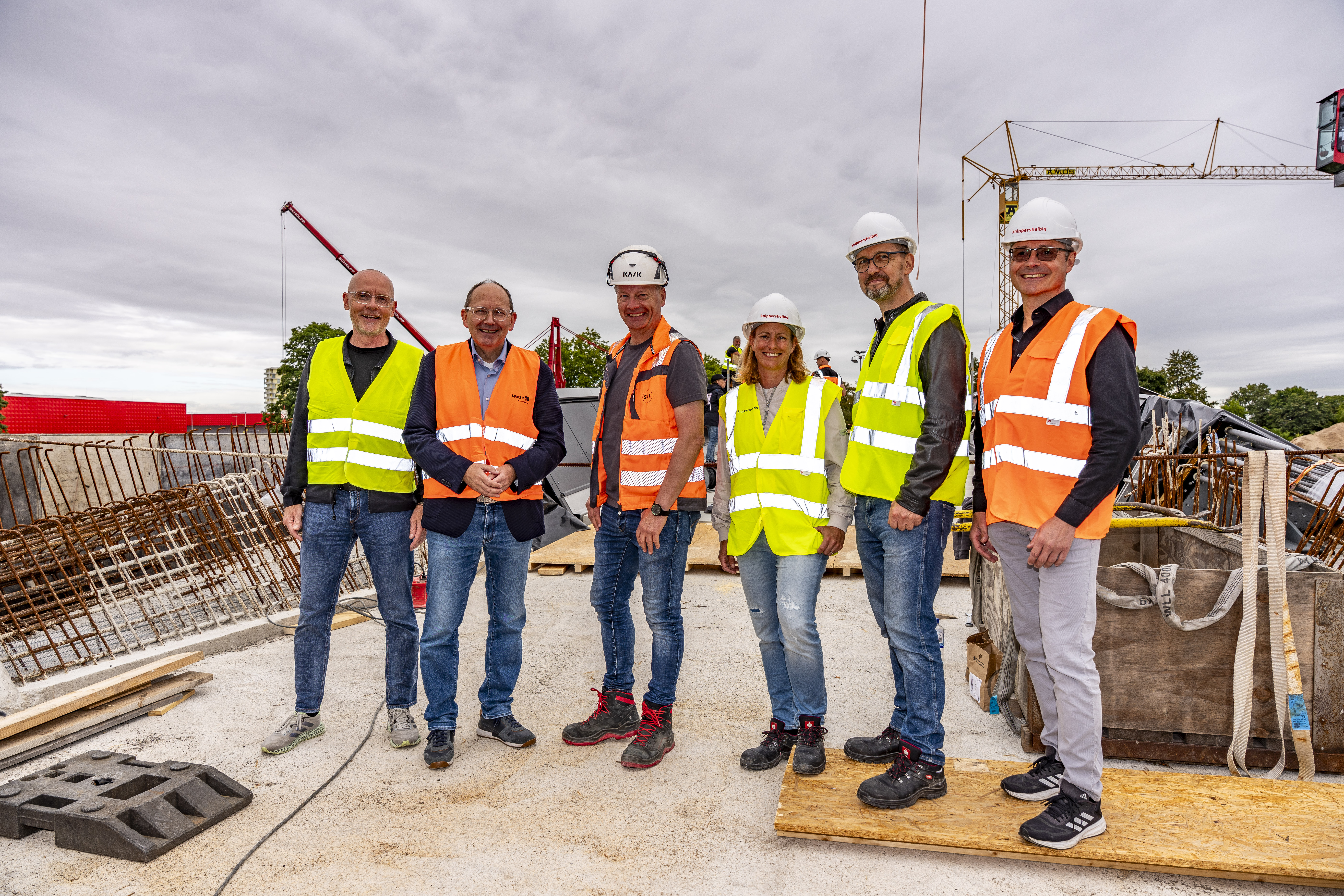 Unser Bild zeigt v.l.n.r.: Achim Judt (Geschäftsführer MWSP), Oberbürgermeister Christian Specht, Josef Schmees (Geschäftsführender Gesell-schafter Schmees & Lühn), Juliane Deubel (Projektleitung knip-pershelbig GmbH), Thorsten Helbig (Partner knippershelbig GmbH), Bau-Bürgermeister Ralf Eisenhauer