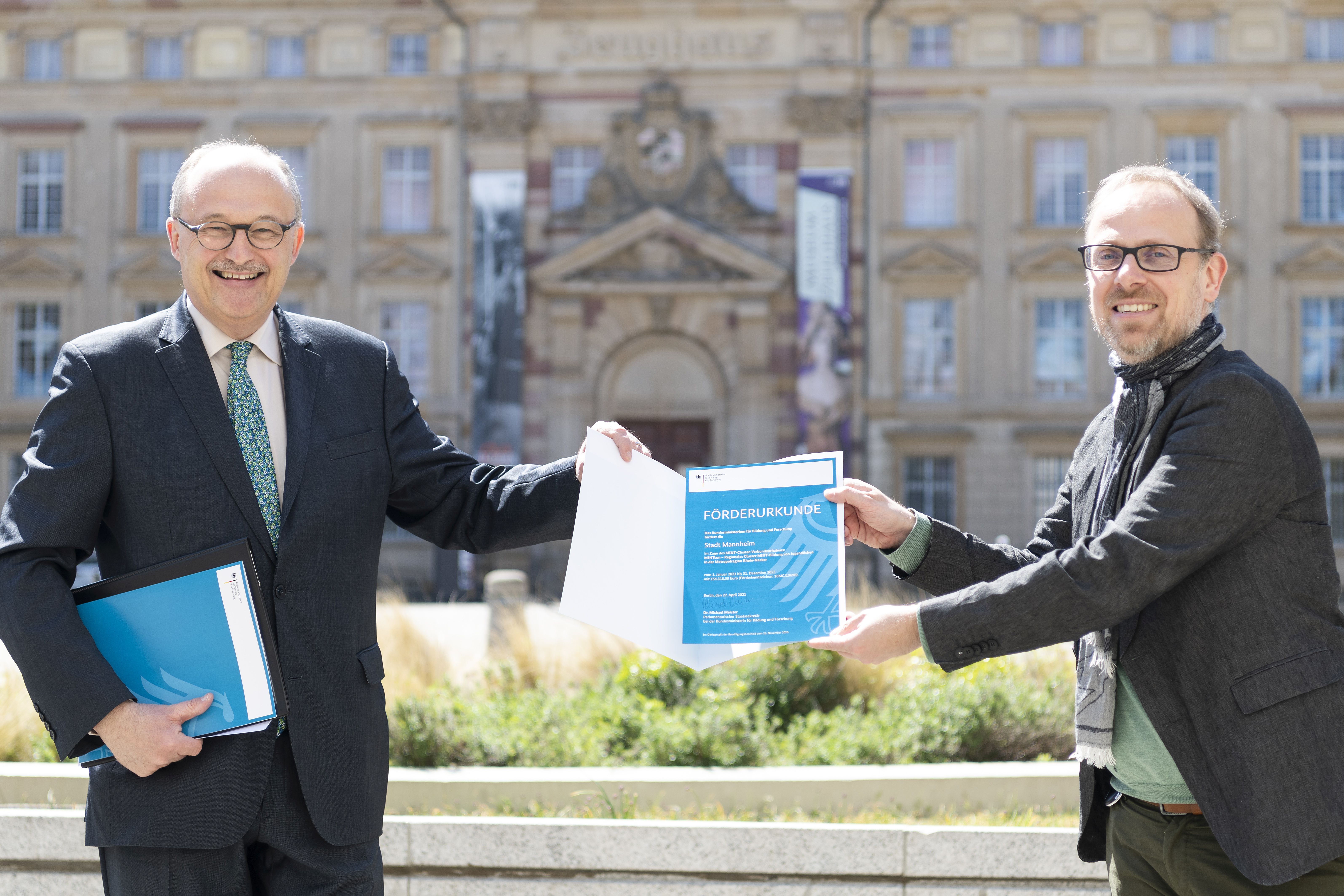Der Parlamentarische Staatssekretär bei der Ministerin für Bildung und Forschung, Dr. Michael Meister, hat am Dienstag, 28.4.21, in Mannheim den offiziellen Förderbescheid des BMBF über 497.000 Euro für das Gemeinschaftsprojekt „MINTcon.“ der Metropolregion Rhein-Neckar GmbH, der Stadt Mannheim und der Hochschule Mannheim übergeben. Mit dem Vorhaben sollen künftig die zahlreichen Einzelprojekte für die MINT-Förderung von Jugendlichen in der Region gebündelt und strategisch miteinander vernetzt werden. An Stadt Mannheim als Kooperationspartnerin übergab Staatssekretär Dr. Meister einen Bescheid über 154.315 Euro, den Bildungsübermeister Dirk Grunert entgegenahm und für die Unterstützung dankte.