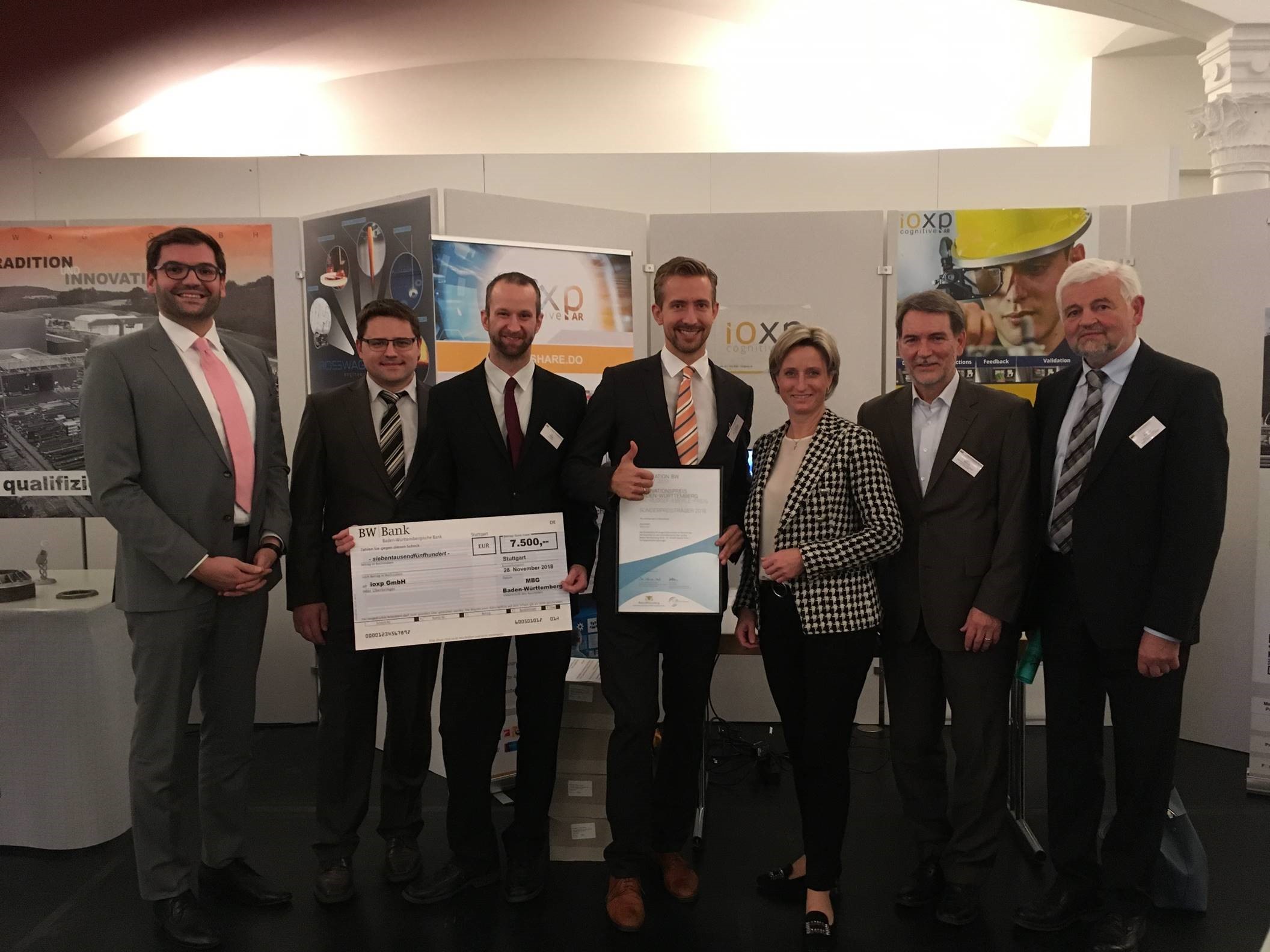 v.r.n.l.: Regierungspräsident Wolfgang Reimer, Regierungsbezirk Stuttgart, Jürgen Münch, Wirtschaftsförderung Mannheim, Wirtschaftsministerin Dr. Nicol Hofmeister-Kraut, Dr. Alexander Lemken, Gründer IOXP, Jan Hirzel, Gründer IOXP, Andreas Neufeld, IOXP, Visar Ramadani, Netzwerk Smart Production