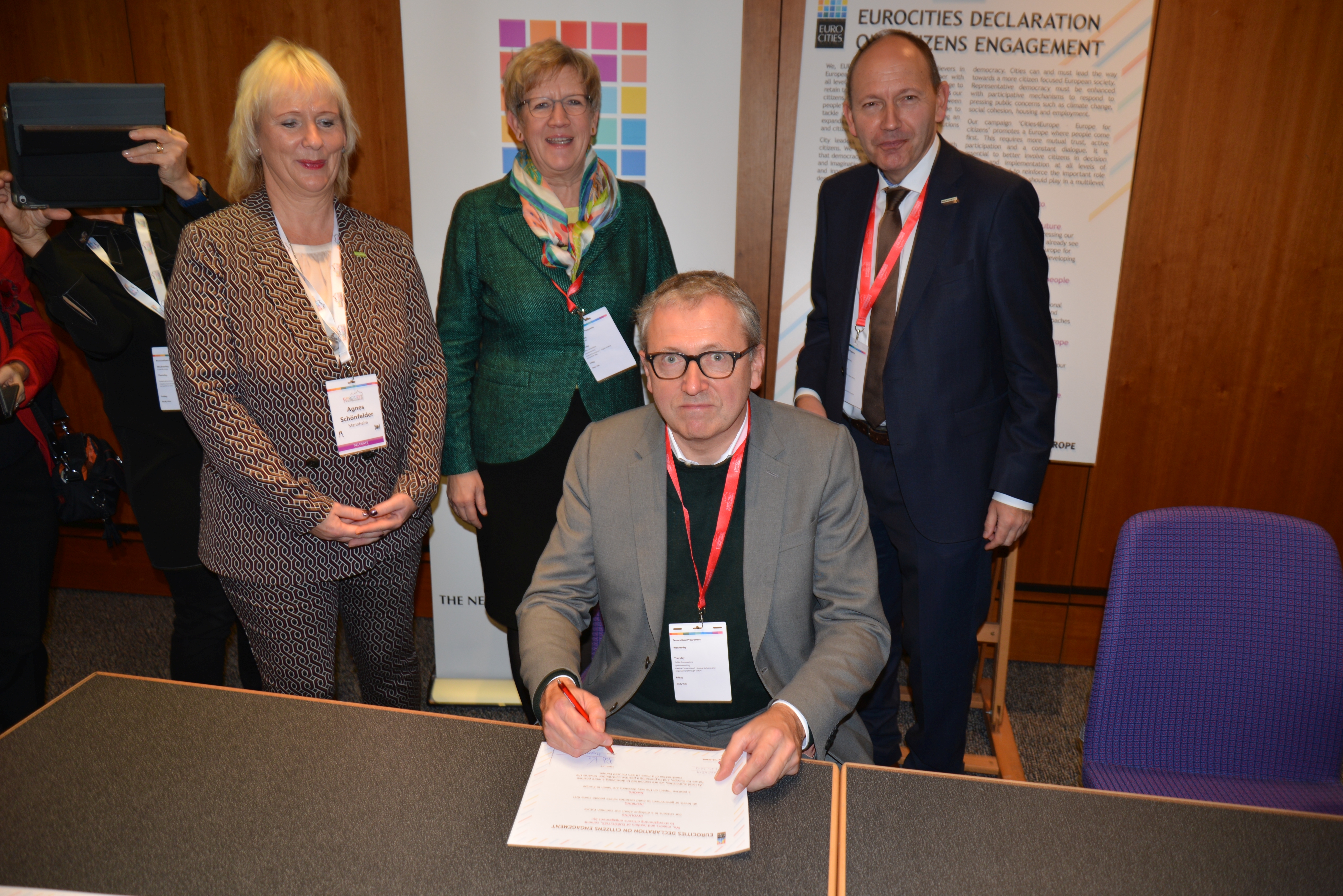 Unser Bild zeigt OB Dr. Peter Kurz bei der Unterzeichnung der EUROCITIES Declaration on Citizens Engagement. Hintere Reihe von links nach rechts: Agnes Schönfelder, Bürgermeisterin Felicitas Kubala, Erster Bürgermeister Christian Specht.