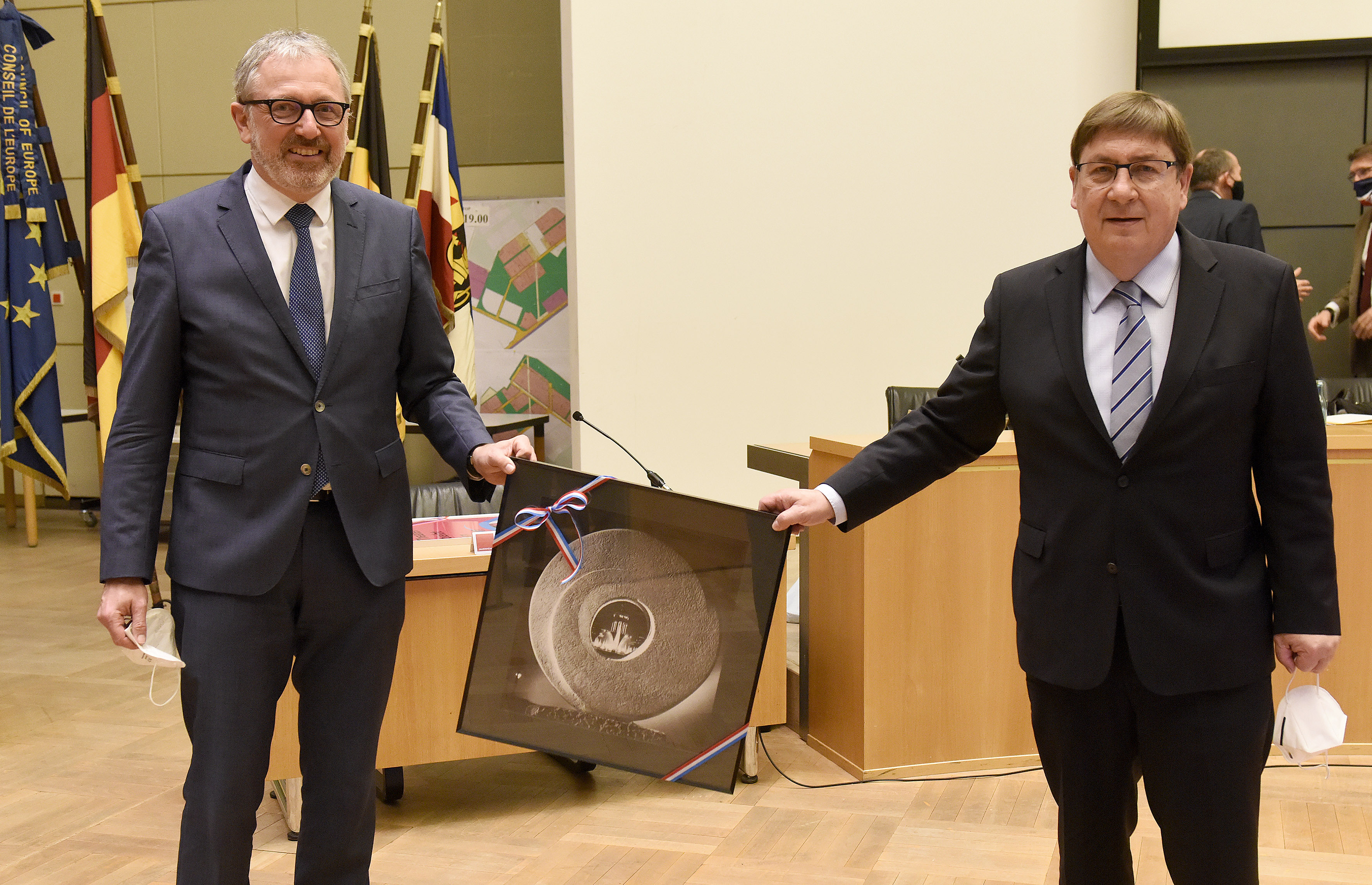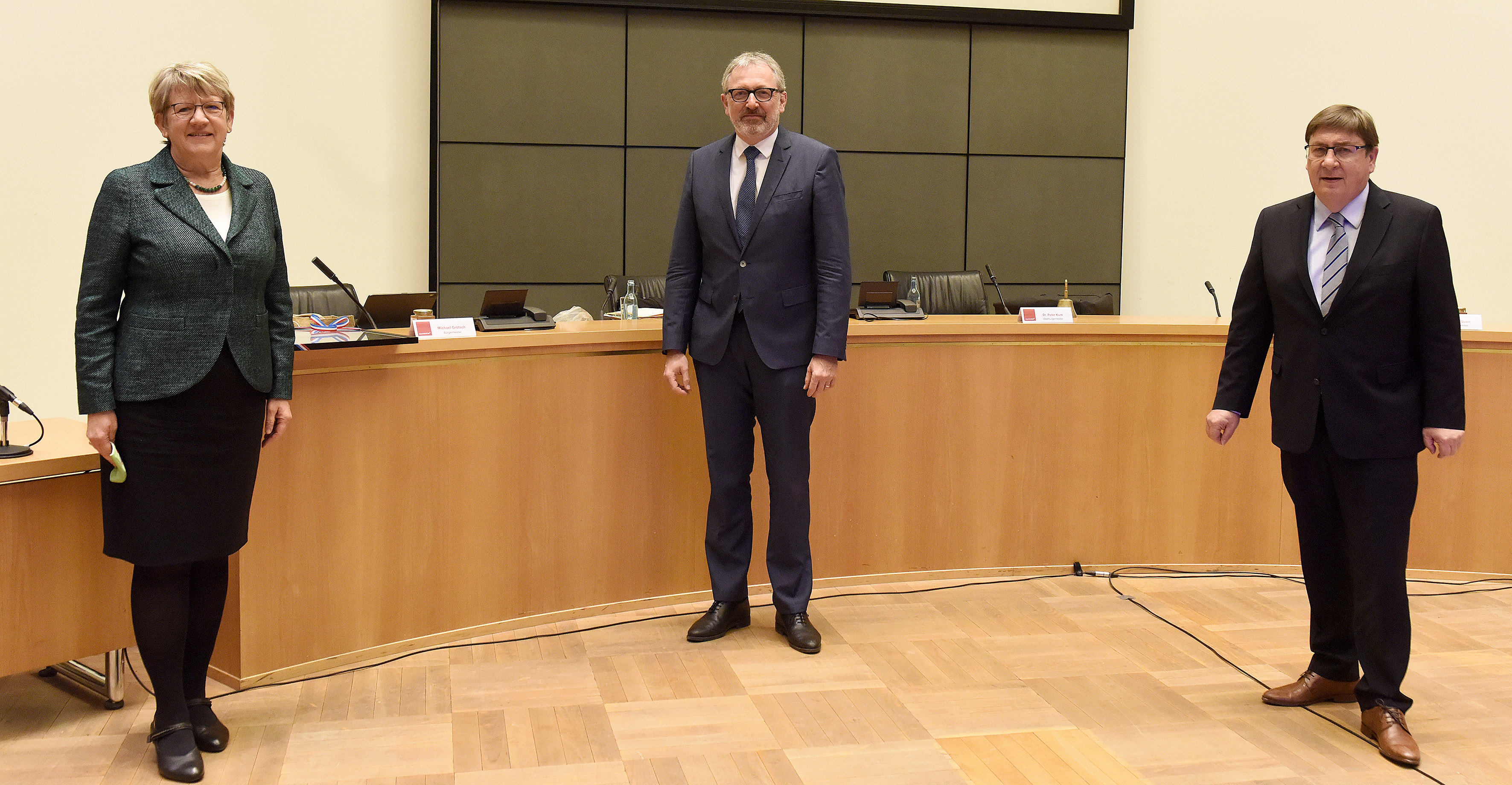Bürgermeisterin Felicitas Kubala, Oberbürgermeister Dr. Peter Kurz und Bürgermeister Lothar Quast bei der Verabschiedung von Kubala und Quast im Rahmen der Sitzung des Gemeinderats am 15. Dezember 2020