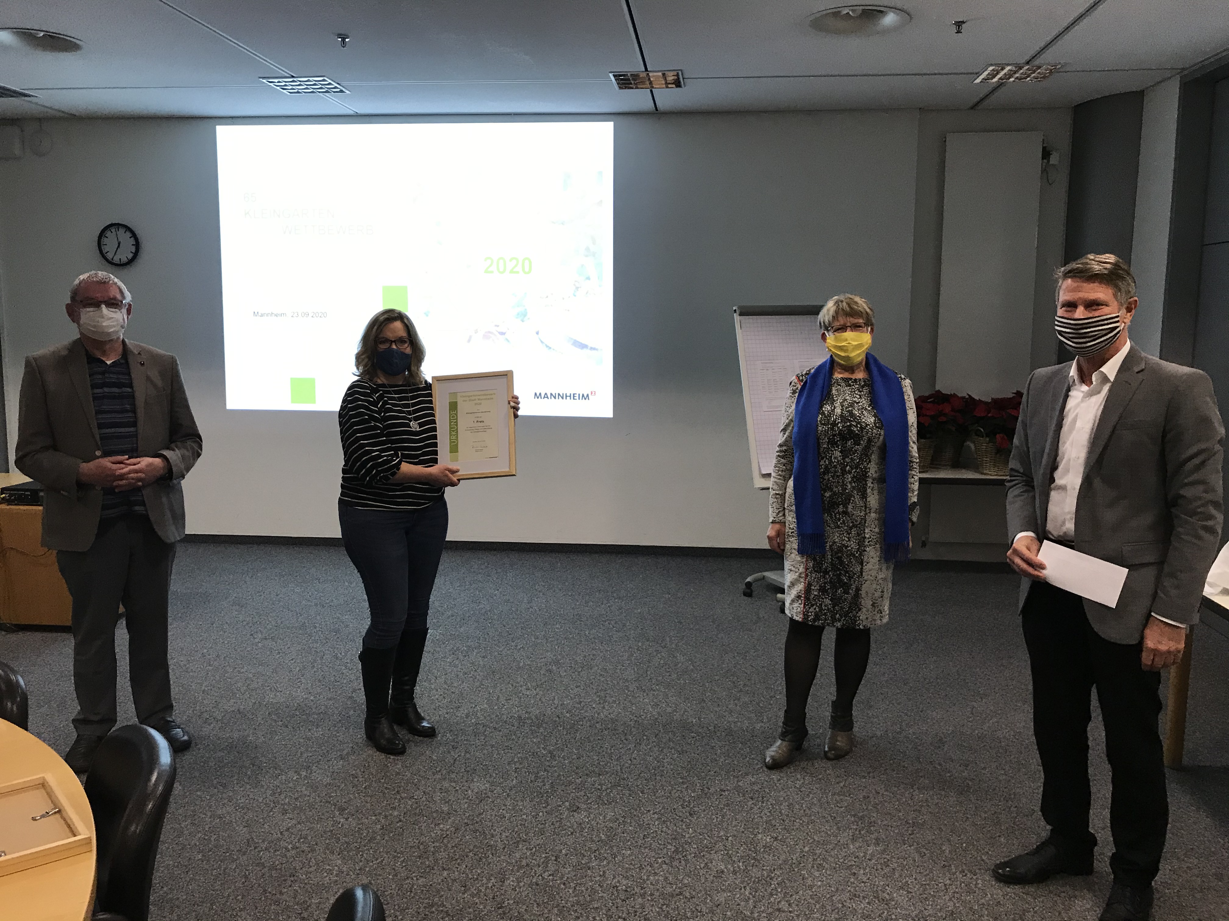 Helmut Losert vom Bezirksverband Gartenfreunde Mannheim e.V., Frau Stermula vom erstplatzierten Kleingartenverein Staudenweg, Bürgermeisterin Felicitas Kubala und Eigenbetriebsleiter Stadtraumservice Markus Roeingh (v.l.)