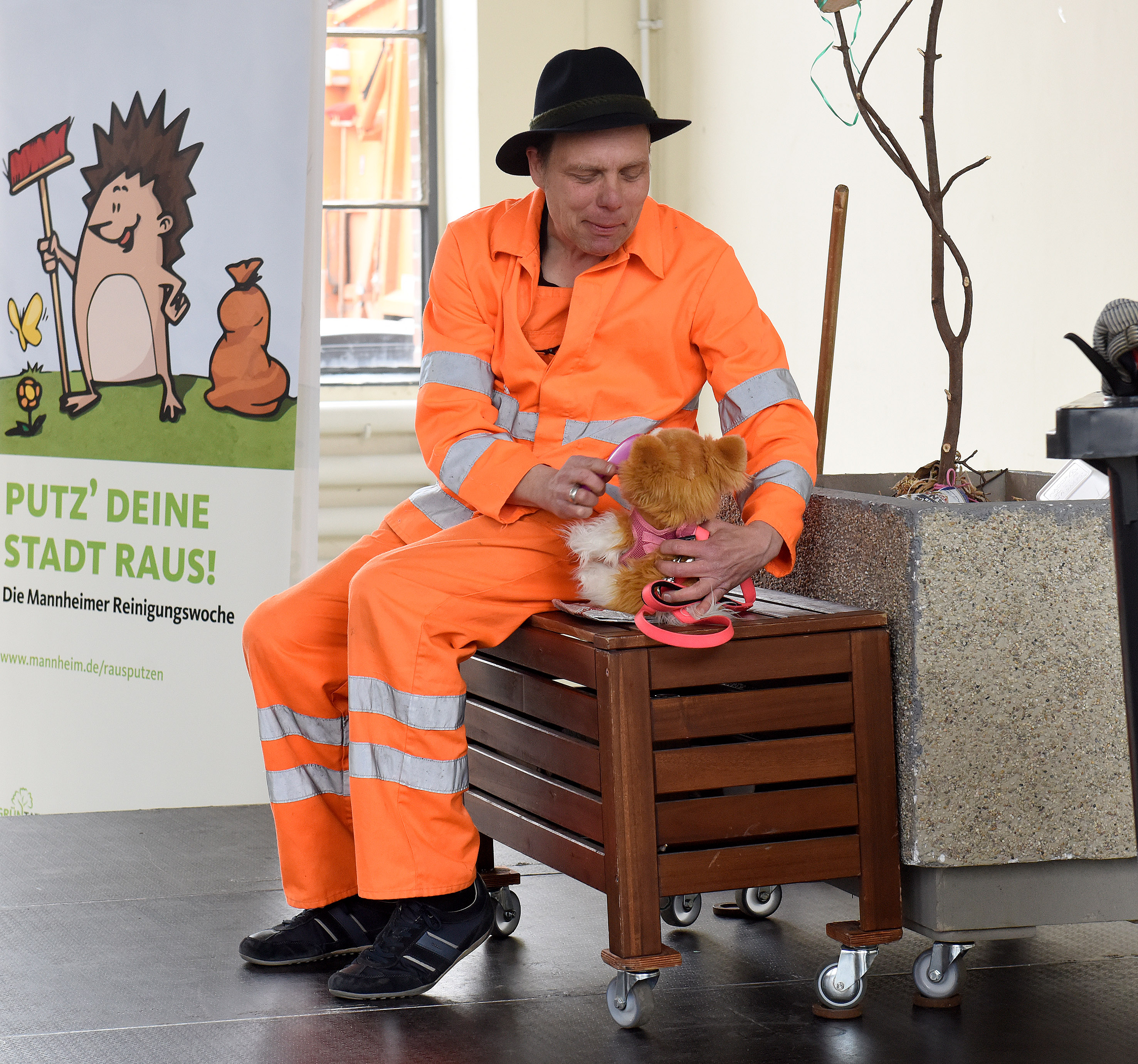 Müllmann „Herr Stinknich“ während seines Auftritts im Rahmen der Reinigungswoche 2019