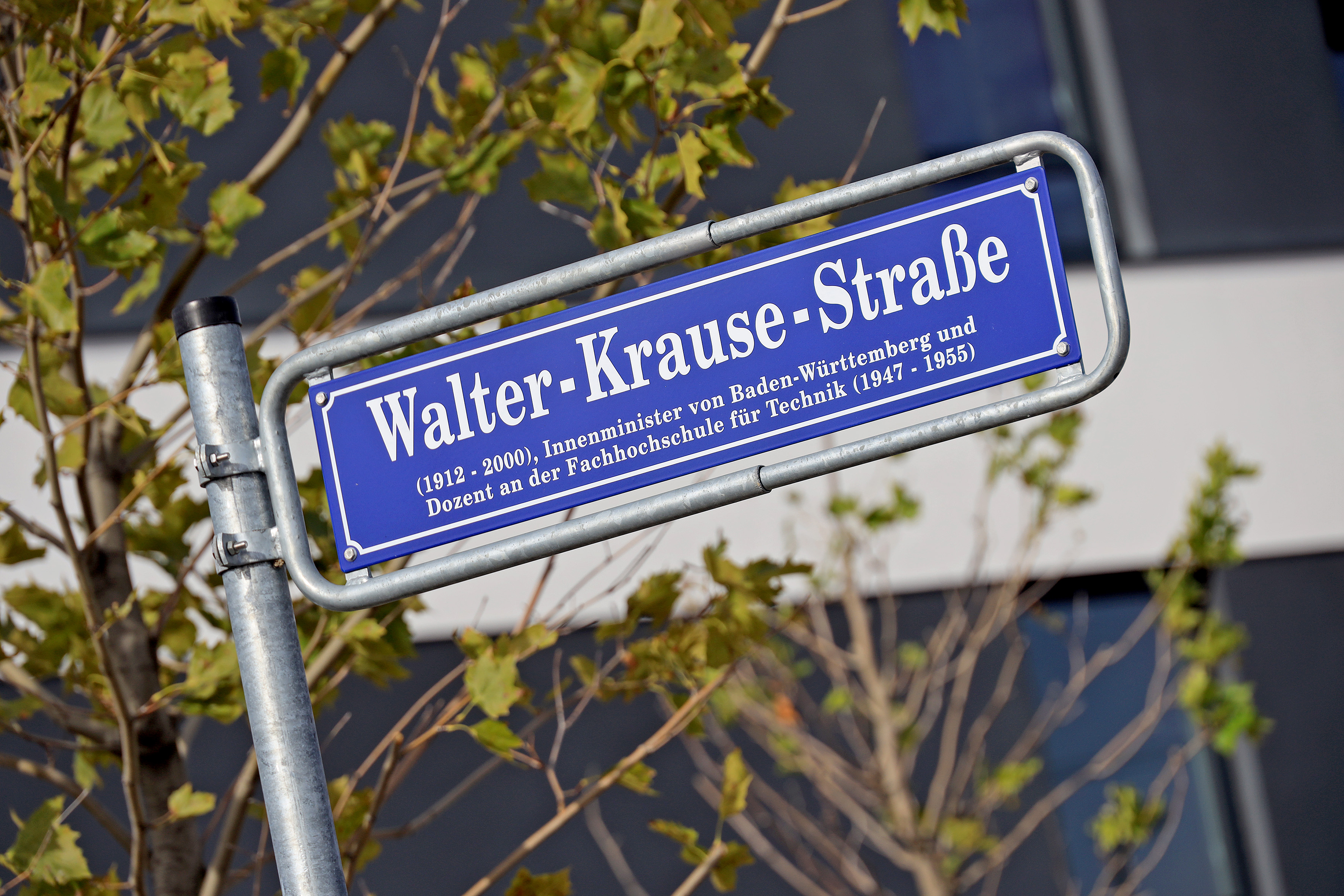 Unser Bild zeigt von links nach rechts: Werner Strähle, Neffe von Walter Krause, Annelie Krause, Tochter von Walter Krause und Oberbürgermeister Dr. Peter Kurz vor dem Straßenschild der Walter-Krause-Straße.