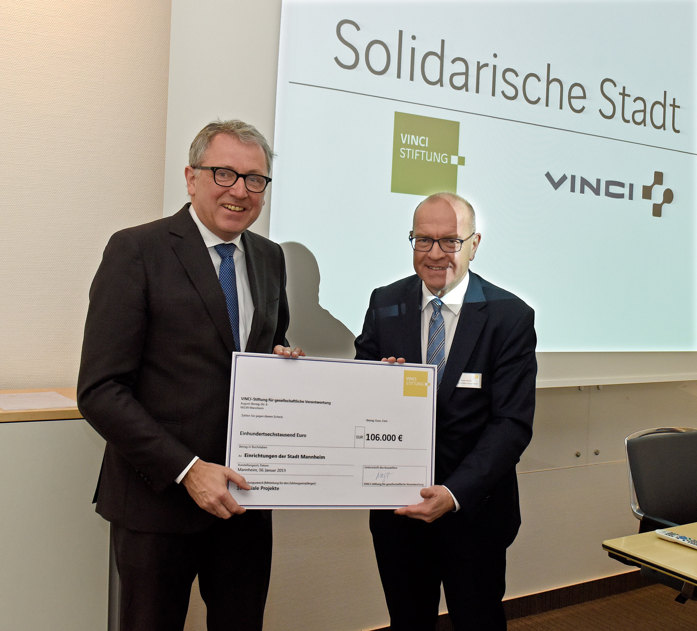 Oberbürgermeister Dr. Peter Kurz (links) erhielt heute im Beisein der Projektträger und -paten den symbolischen Fördermittel-Scheck von Rainer Beisel, Geschäftsführer der VINCI Facilities Deutschland GmbH..