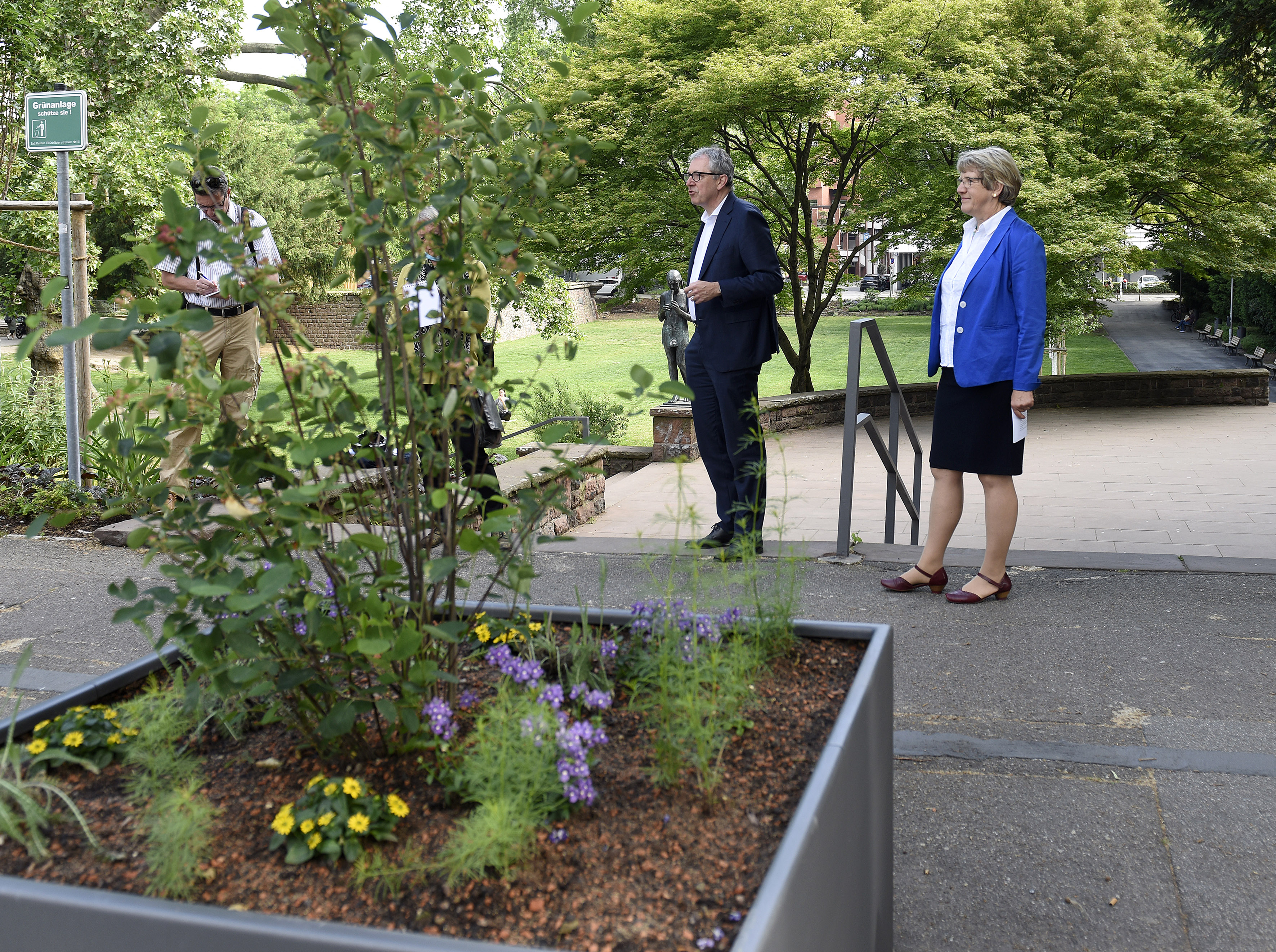 Oberbürgermeister Dr. Peter Kurz und Bürgermeisterin Felicitas Kubala stellen die Aufwertungen in den Innenstadtgärten vor.
