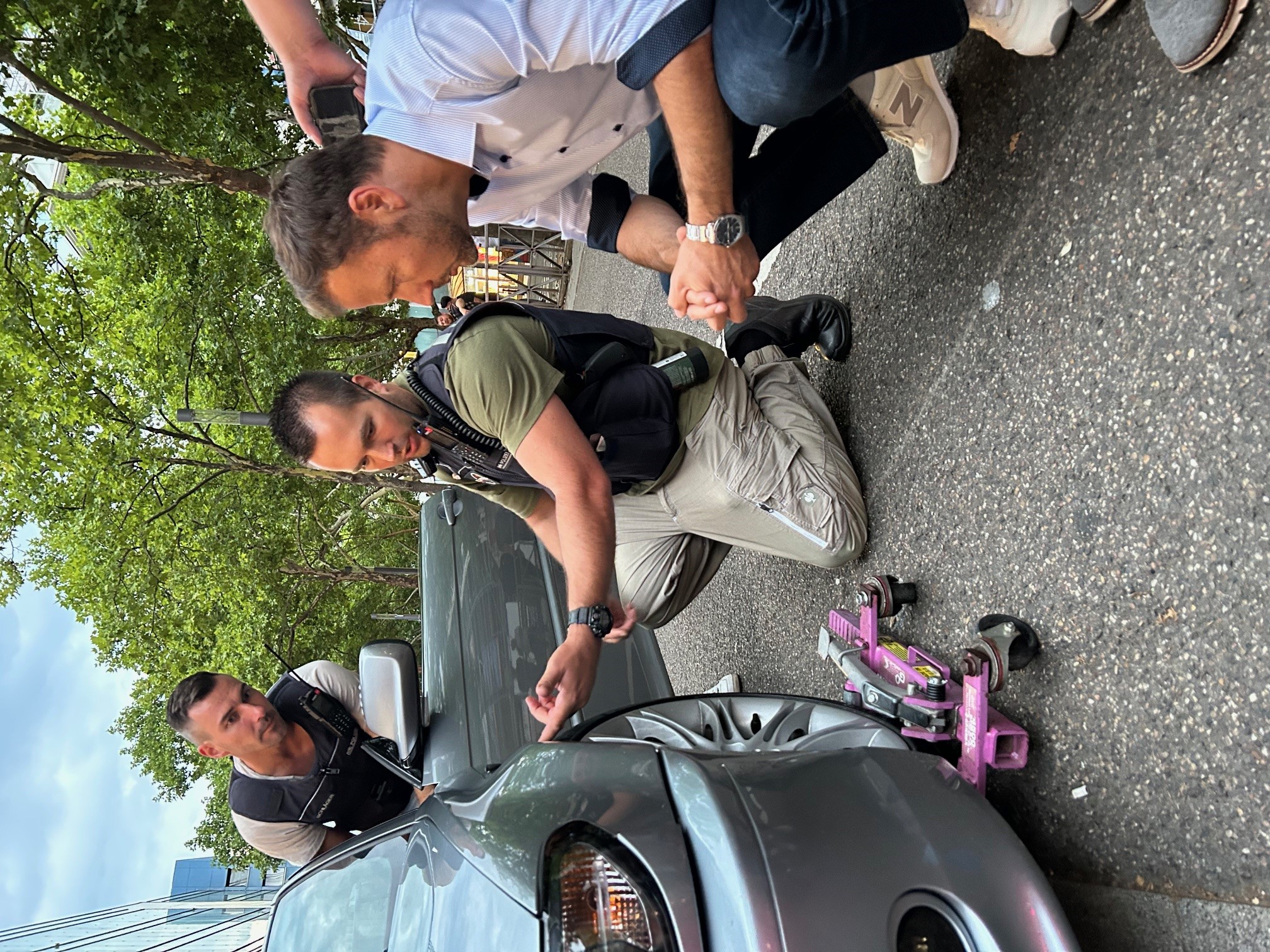 Bürgermeister und Sicherheitsdezernent Dr. Volker Proffen lässt sich von Beamten der Polizei erklären, welche Untersuchungen an dem getunten Fahrzeug durchgeführt werden.