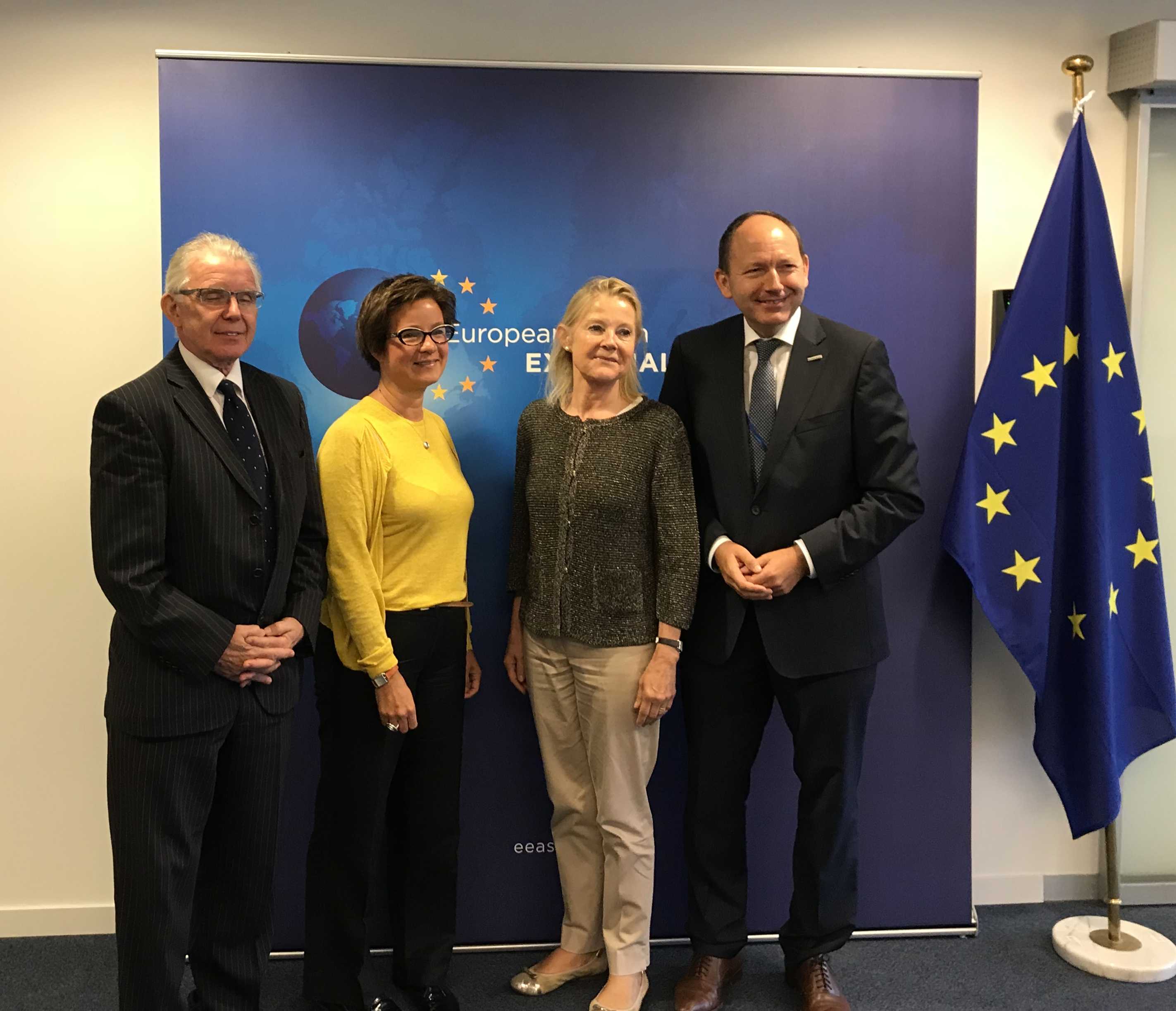 Erster Bürgermeister Christian Specht mit Ronald Hall, Senior Berater der Europäischen Kommission für internationale Beziehungen (links), und Lotte Knudsen, Generaldirektorin für Menschenrechte, globale und multilaterale Angelegenheiten des Europäischen Auswärtigen Dienstes (zweite von rechts) sowie Nona Deprez (Europäische Kommission, zweite von links)