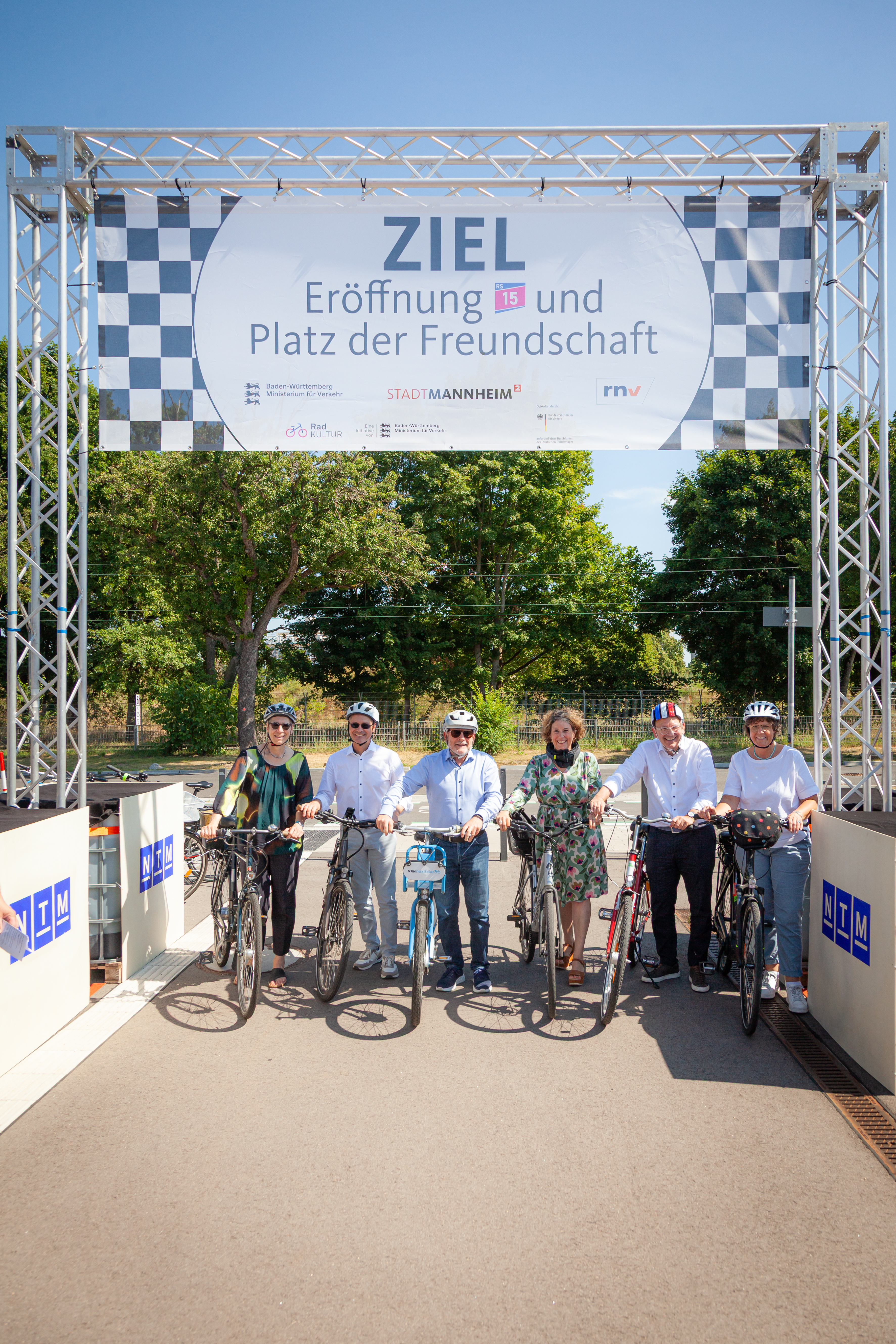 Staatssekretärin Elke Zimmer, Bürgermeister Ralf Eisenhauer, Verkehrsminister Winfried Hermann, Erste Bürgermeisterin Prof. Dr. Diana Pretzell, Oberbürgermeister Christian Specht und Regierungspräsidentin Sylvia M. Felder (v.l.) sind nach der Befahrung des RS 15 am Ziel angekommen