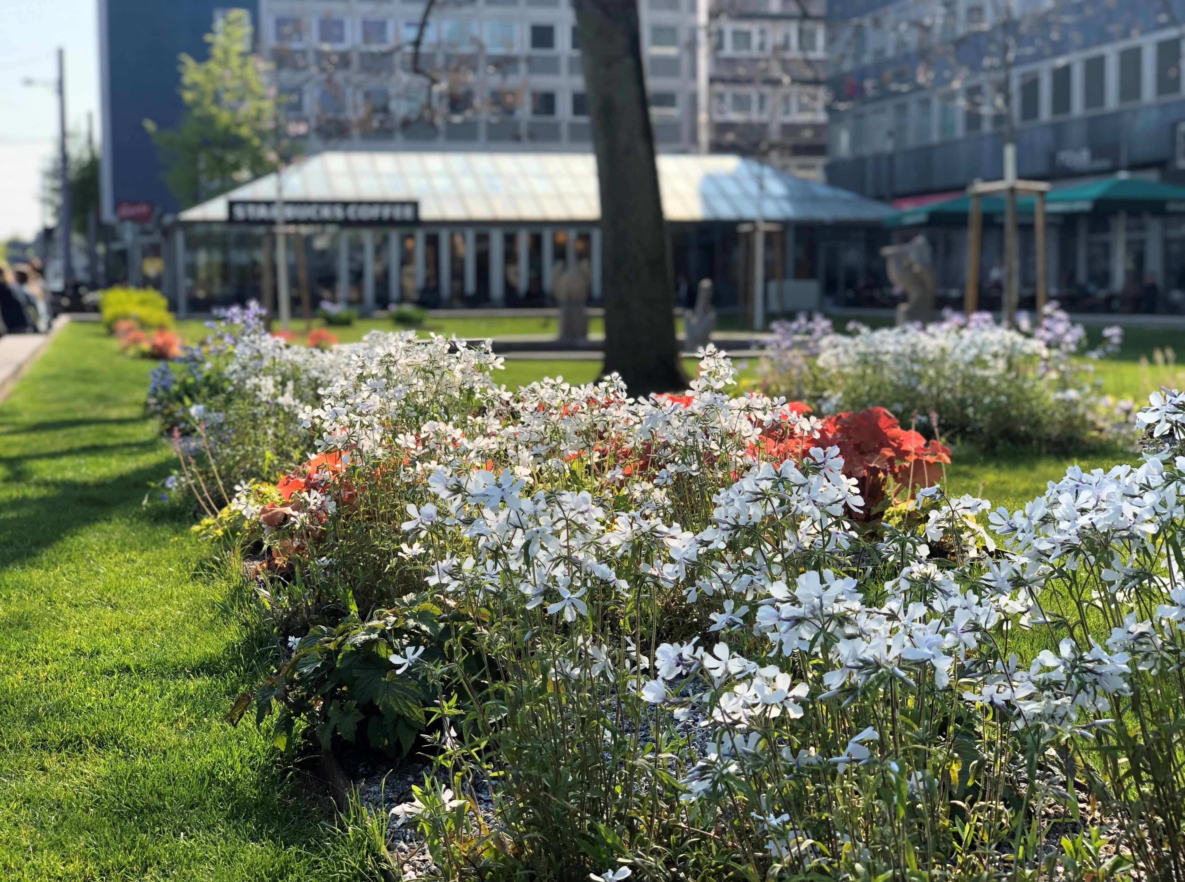 OB Dr. Kurz (rechts) und Staatssekretär Baumann zusammen mit Agnes Schönfelder von der Klimaschutzagentur am Maimarktstand der Stadt Mannheim.
