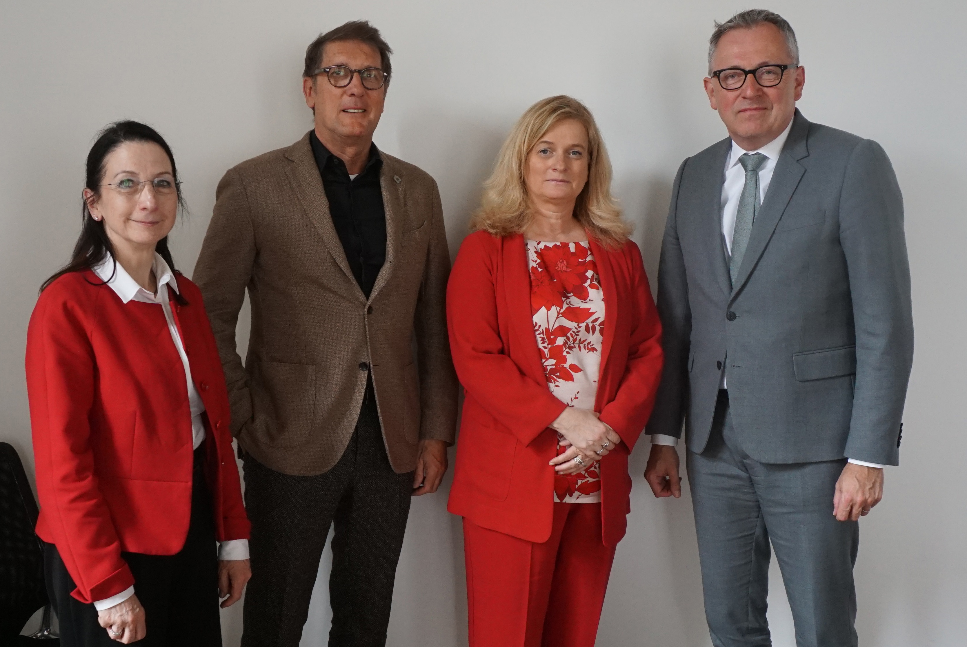 Dr. Ulla Engelmann (Abteilungsleiterin Advanced Technologies, Clusters and Social Economy in der DG GROW der EU Kommission) (2.v.r) im Gespräch mit Oberbürgermeister Dr. Peter Kurz (r.), Wirtschaftsbürgermeister Michael Grösch (2.v.l.) und Christiane Ram (Leiterin des Fachbereichs für Wirtschafts- und Strukturförderung) (l) zu den geplanten Social Economy Summit 2020 in Mannheim