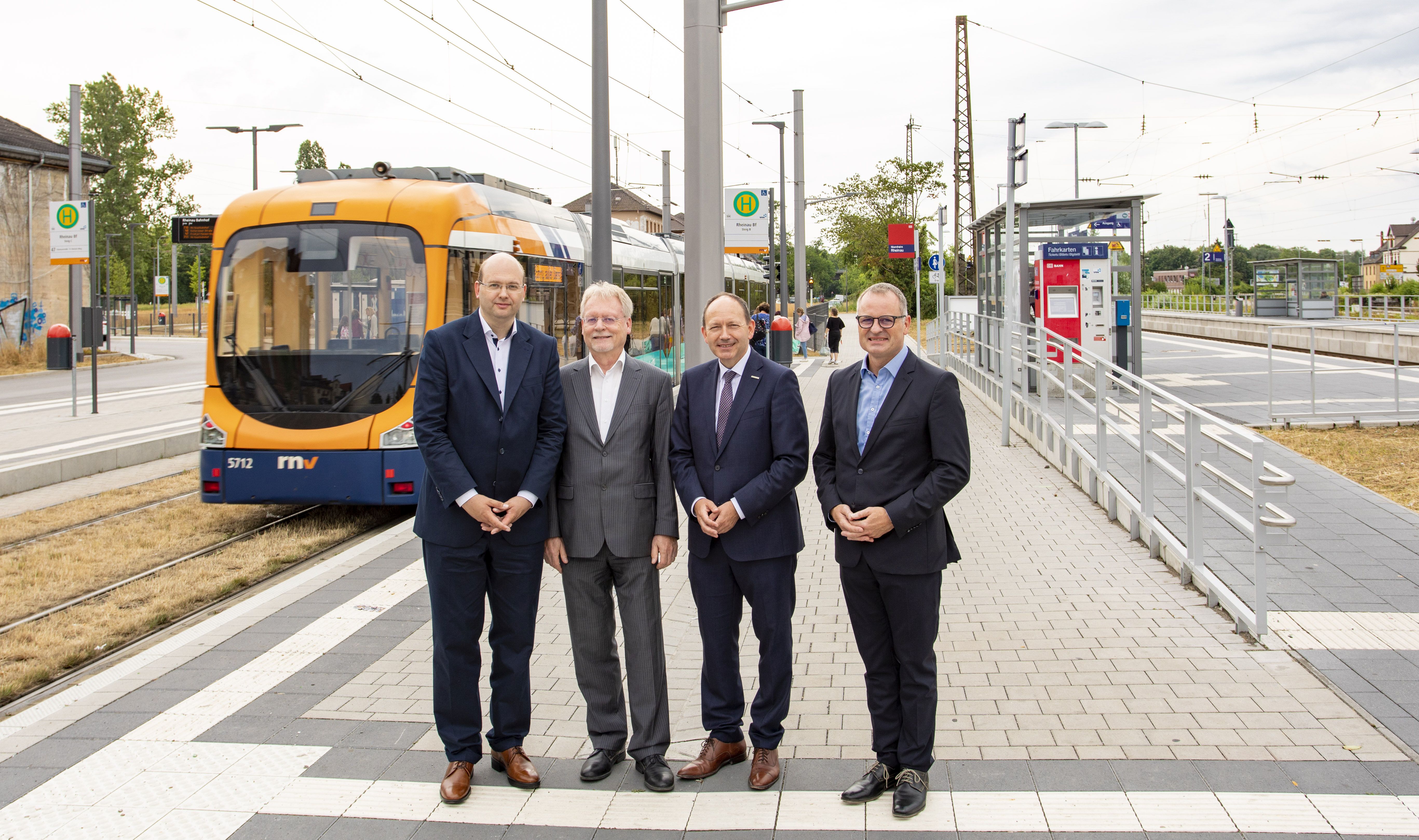 Weihten den neuen Kompaktbahnhof ein (von links): Marcus Geithe, Geschäftsführer MV Mannheimer Verkehr GmbH, Volkhard Malik, Geschäftsführer Verkehrsverbund Rhein-Neckar (VRN), Christian Specht, Erster Bürgermeister und ÖPNV-Dezernent Stadt Mannheim, und Michael Groh, Leiter Regionalbereich Südwest DB Station&Service AG.