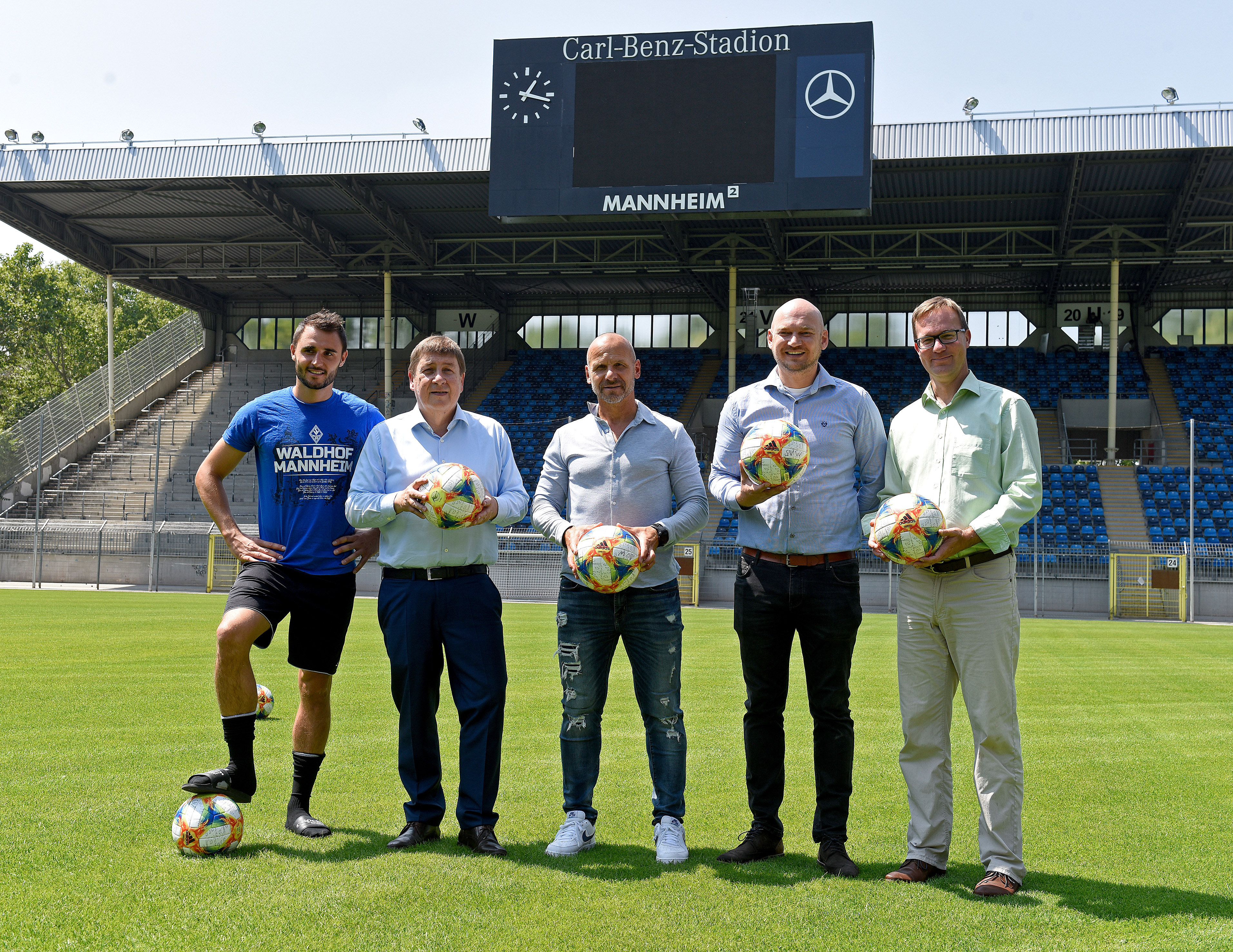 v.l.n.r.: Kevin Conrad, Spielführer SV Waldhof Mannheim, Lothar Quast, Sportbürgermeister Stadt Mannheim, Bernhard Trares, Trainer SV Waldhof Mannheim, Markus Kompp, Geschäftsführer SV Waldhof Mannheim, Uwe Kaliske, Fachbereichsleiter Sport und Freizeit