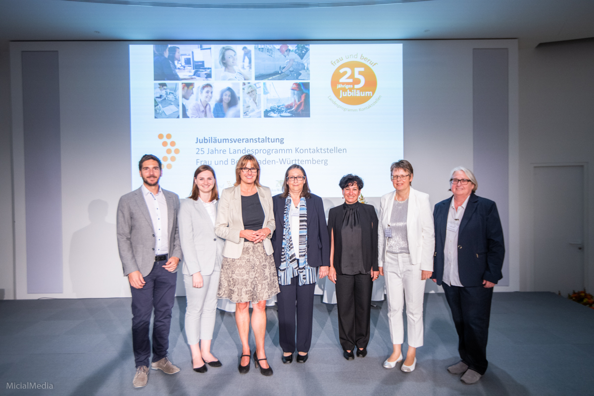 Unser Bild zeigt von links nach rechts: Danyel Atalay, Wirtschaftsförderer des Rhein-Neckar-Kreises, Regina Schäfer, Beraterin in der Kontaktstelle, Katrin Schütz, Staatssekretärin im Wirtschaftsministerium Baden-Württemberg, Beate Reichelstein, Leiterin der Kontaktstelle, Zahra Deilami, Gleichstellungsbeauftragte der Stadt Mannheim, Dr. Birgit Buschmann, Wirtschaftsministerium Baden-Württemberg, Gabriele Daniel, Leiterin der Kontaktstelle