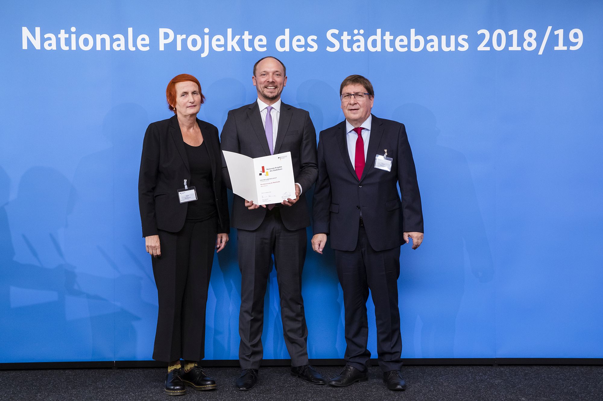 v.l.n.r.: Tatjana Dürr, Referentin für Baukultur der Stadt Mannheim, Marco Wanderwitz, Parlamentarischer Saatssekretär BMI, Lothar Quast, Bürgermeister Stadt Mannheim