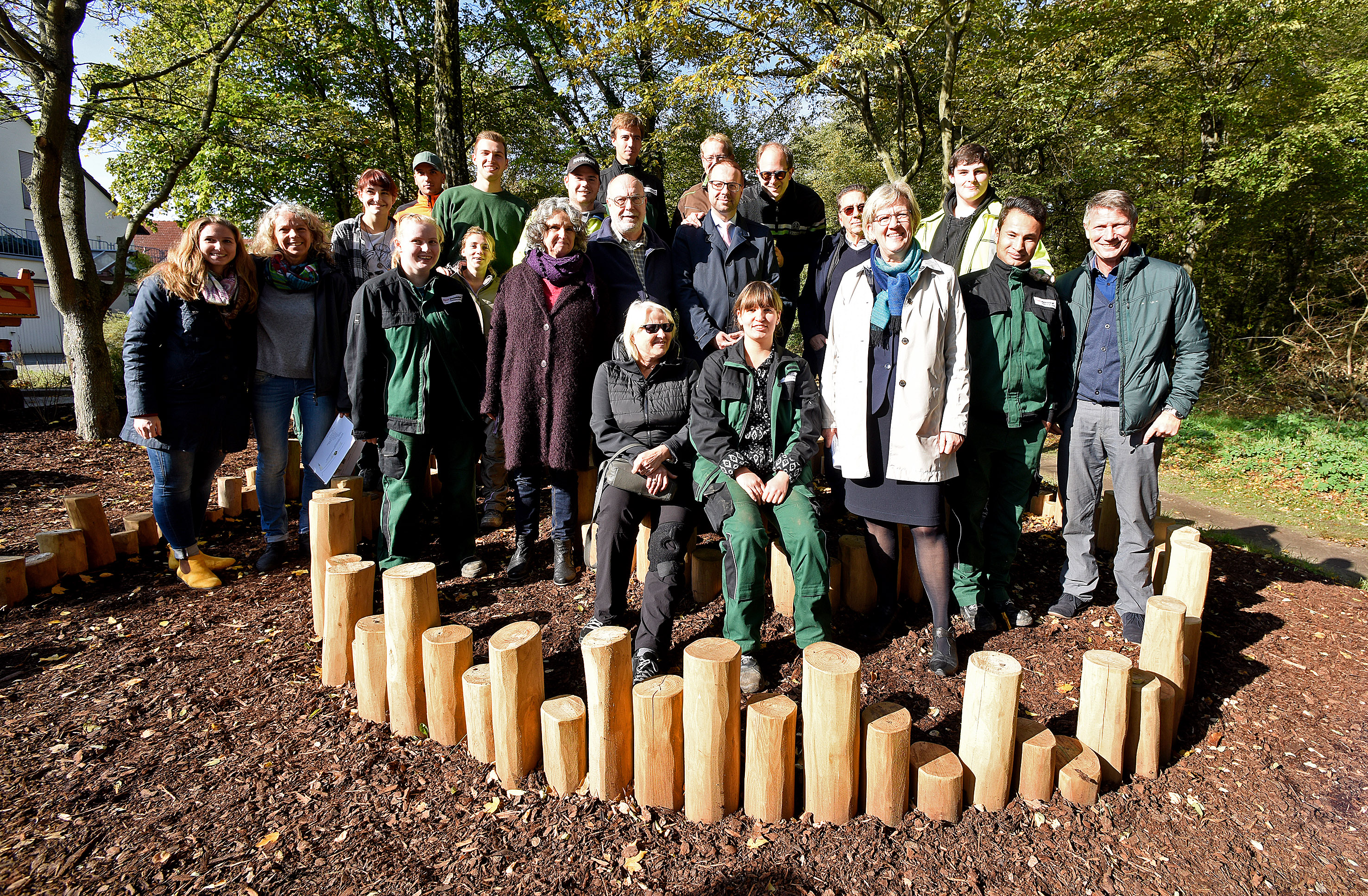 Bürgermeisterin Felicitas Kubala weiht den Spielplatz Hainbuchenhof zusammen mit Gemeinderäten und Auszubildenden des Fachbereiches Grünflächen und Umwelt ein.