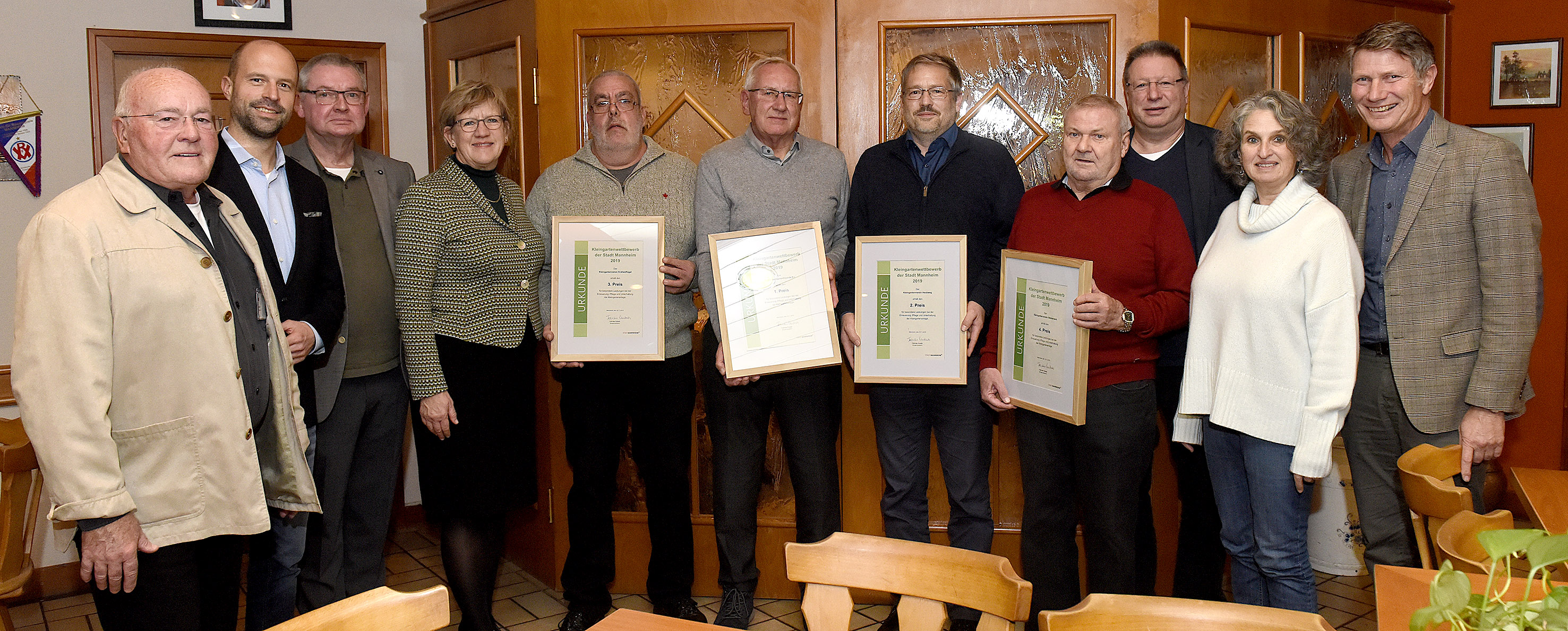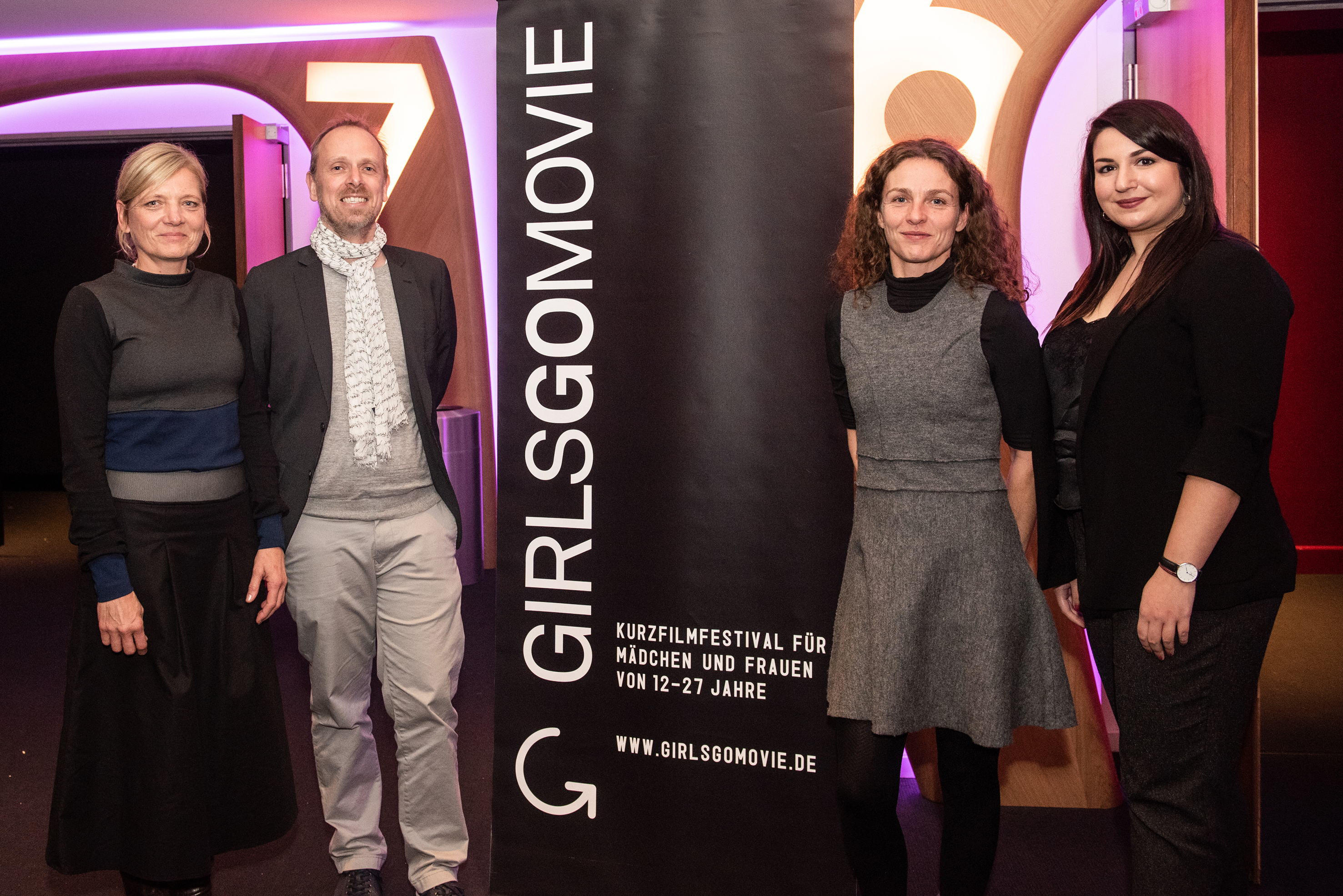 Preisverleihung Girls go Movie 2019 - die Preisträgerinnen mit Bürgermeister Dirk Grunert (links im Bild) und Dr. Wolfgang Kreißig, Präsident der Landesanstalt für Kommunikation Baden-Württemberg (LFK)