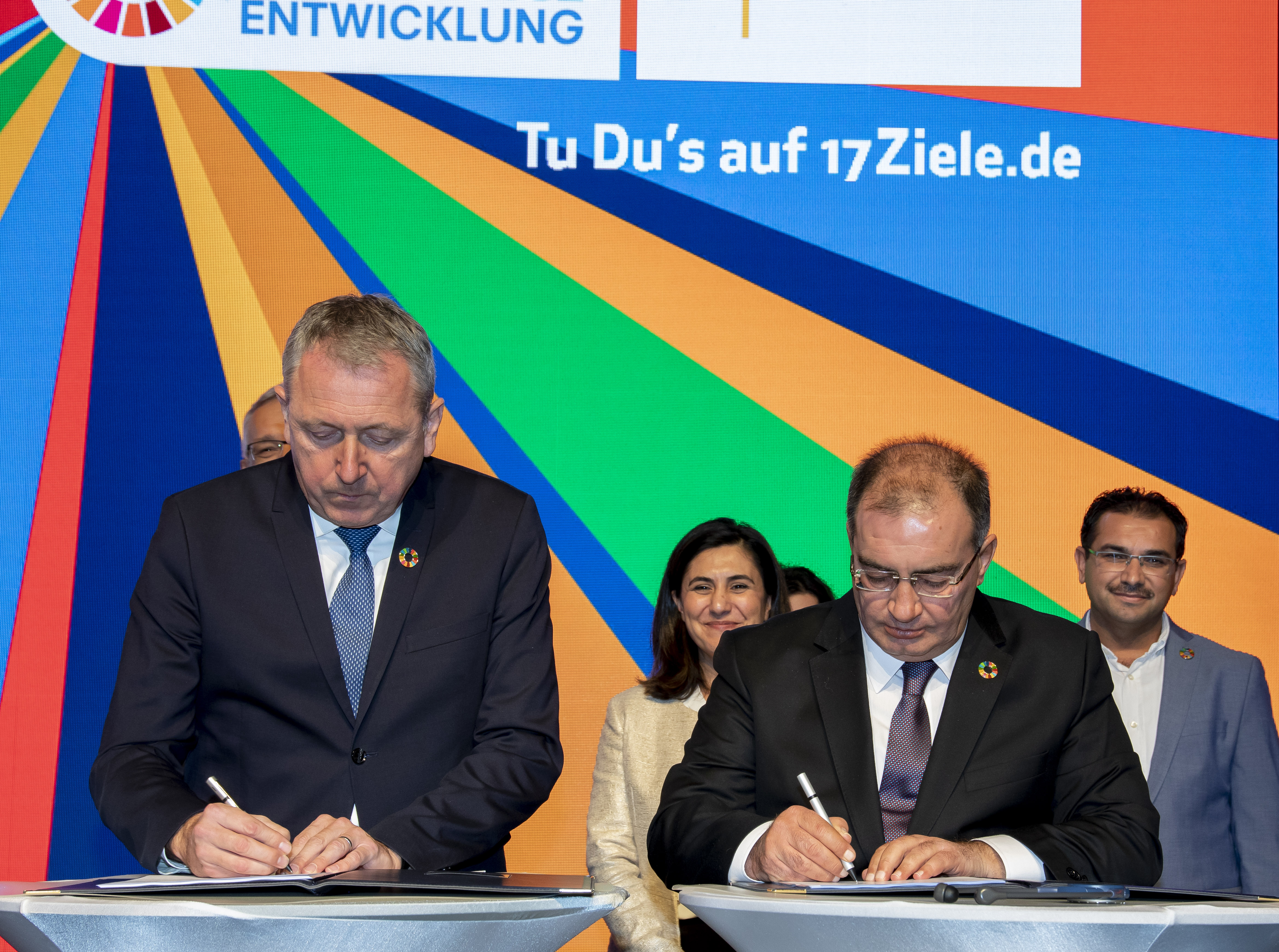 Unser Bild zeigt von links nach rechts: Oberbürgermeister Dr. Peter Kurz, Mehmet Abdi Bulut, Bürgermeister der Stadt Kilis, Banu Terzioğlu, türkische Generalkonsulin, Martin Jäger Staatssekretär im Bundesministerium für wirtschaftliche Zusammenarbeit und Entwicklung sowie Mustafa Dedekeloglu, zivilgesellschaftlicher Initiator der Partnerschaft mit Kilis.