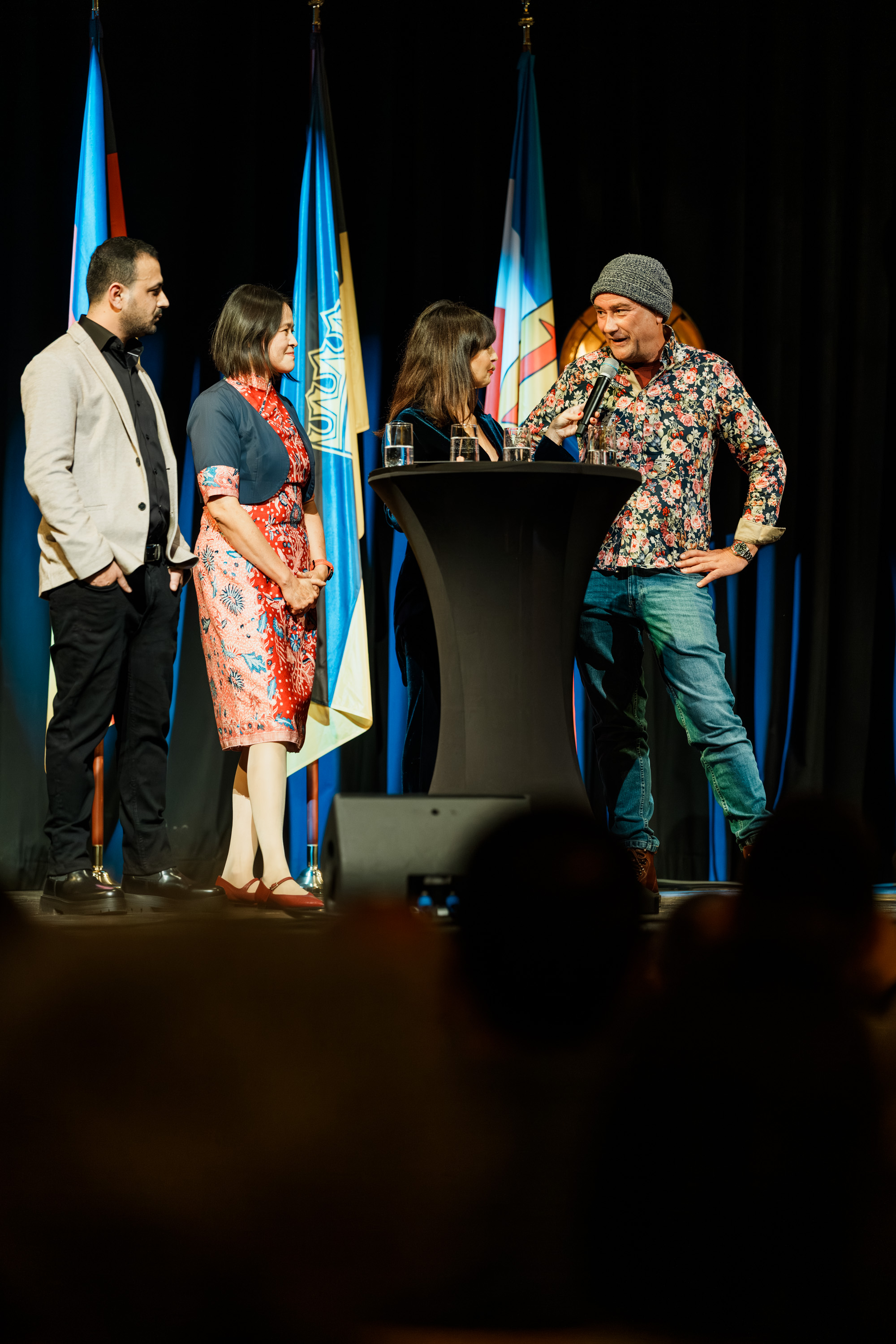 Eine Talkrunde mit Neubürgerinnen und Neubürgern beschäftigte sich mit dem Thema „Die deutsche Staatsbürgerschaft“. Daran nahmen Lucia Santoso aus Australien, Mehran Sunny aus Pakistan und Robert Green aus Großbritannien teil. Musikalisch umrahmt wurde die Einbürgerungsfeier von Jamie Lee Imhof, Merve Uslu-Ersoy, Kira Reiter und Michael Kuhn.