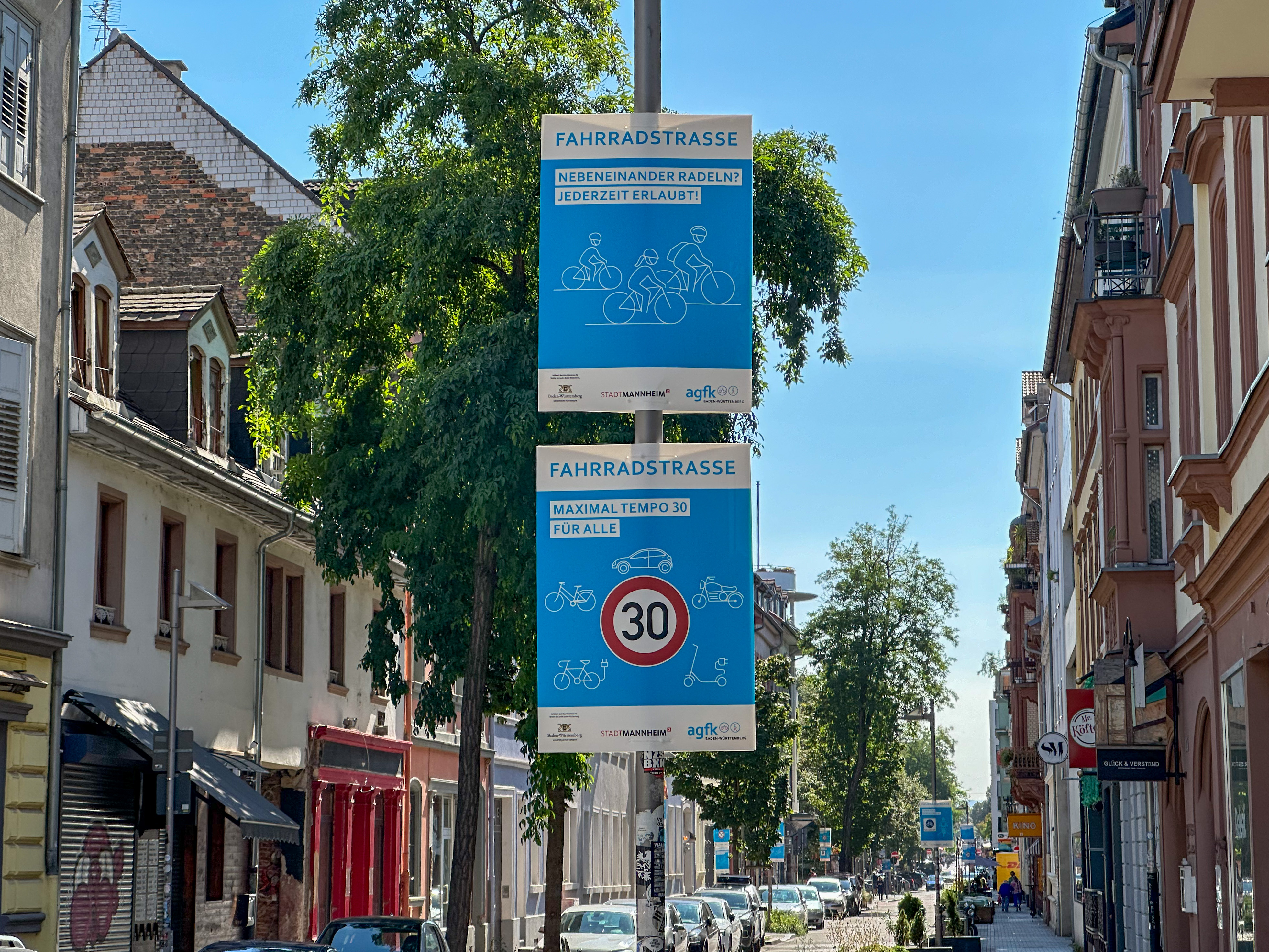 Auch der städtischen Verkehrsplanung ist das Miteinander im Straßenverkehr wichtig, weshalb beispielsweise diesen Sommer gemeinsam mit der ehrenamtlichen Fahrradbeauftragten Gabriele Fröhlich Plakate in den Quadraten aufgehängt wurden, die Autofahrenden und Radfahrenden helfen, die Regelungen in den Fahrradstraßen zu verstehen und für mehr Sicherheit sorgen. Auch in der Rheingoldstraße in Neckarau sensibilisieren Plakate für das dort bestehende Überholverbot von Radfahrenden, weil der Sicherheitsabstand von mindestens 1,5m nicht eingehalten werden kann.
