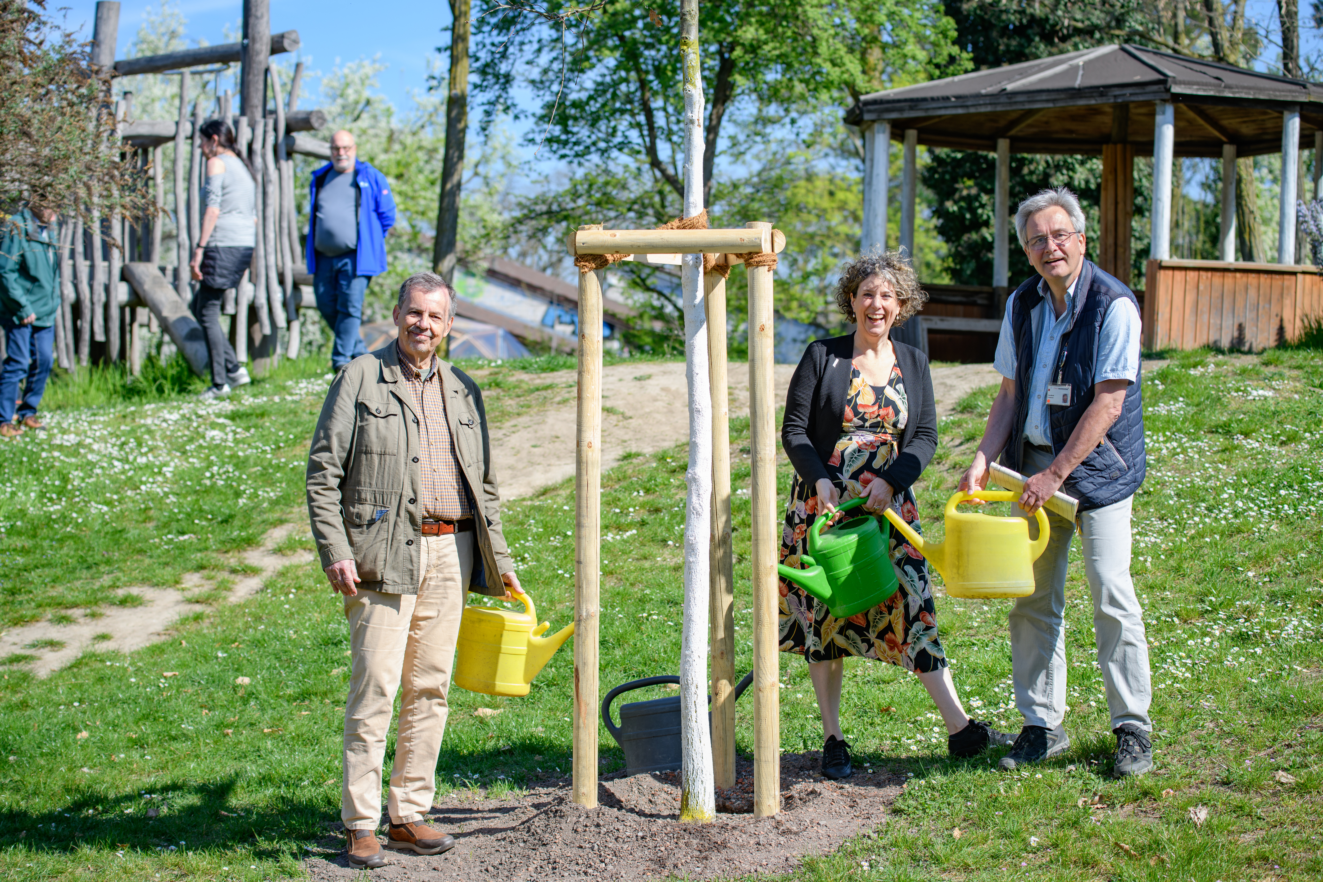 Zwei frisch gepflanzte Eichen stehen jetzt auf dem Abenteuerspielplatz des städtischen Jugendhauses an der Waldpforte: Eine Roteiche und eine Stieleiche. Die Roteiche hat der Mannheimer Kreisverband der Schutzgemeinschaft Deutscher Wald (SDW) bereits im Vorgriff zum diesjährigen Tag des Baumes (25. April) gespendet. Gepflanzt wurde sie von der Wald-Erlebnis-Gruppe, die vom Jugendhaus und dem Waldhaus Mannheim betreut wird. Die bei uns heimische Stieleiche hat der Stadtraumservice gepflanzt. Ebenfalls am Samstag, vor der Urkunden-Übergabe im Bürgerpark, trafen sich Erste Bürgermeisterin Prof. Dr. Diana Pretzell und der SDW-Vorsitzende Sebastian Eick mit Manuel D’Auria vom Jugendhaus Waldpforte auf dem Abenteuerspielplatz, um die jungen Eichen anzugießen. „Die Roteiche ist Baum des Jahres 2025“, erklärte Pretzell und bedankte sich bei SDW und dem Jugendhaus: „Die SDW spendet seit vielen Jahren im April, zum internationalen Tag des Baumes, einen Baum für Mannheim. Sie macht damit deutlich, wie wichtig Bäume für das Ökosystem und für uns Menschen sind. Das Jugendhaus ist seit über 60 Jahren ein Treffpunkt für Kinder und Jugendliche mit Angeboten von Sport, Theater, Spielen über Kochen und Werken bis hin zu Medien. Die Wald-Erlebnis-Gruppe bringt jungen Menschen ab neun Jahren mit Waldhandwerk, Pflanzenbestimmen, Outdoor-Cooking und anderen Abenteuern die Natur vor Ihrer Haustür näher. Ich danke der SDW, dem Jugendhaus und dem Waldhaus für ihre wertvolle Arbeit!“