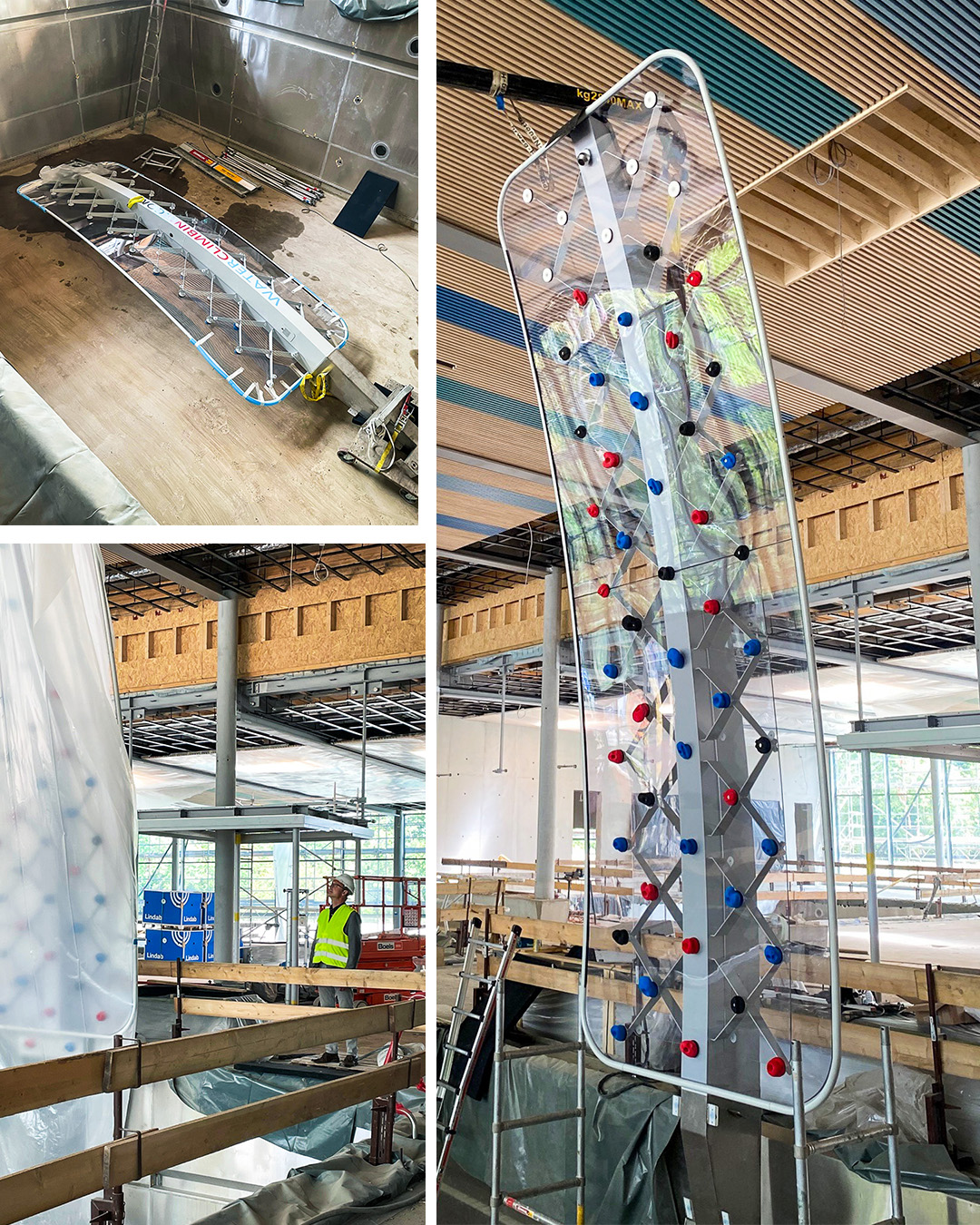 Die Kletterwand wurde jetzt geliefert und am Sprungbecken gegenüber den Sprungtürmen aufgebaut. Sie ist über 5 Meter hoch und 2 Meter breit – ein weiters Highlight im neuen Kombibad, das 2026 eröffnet wird.