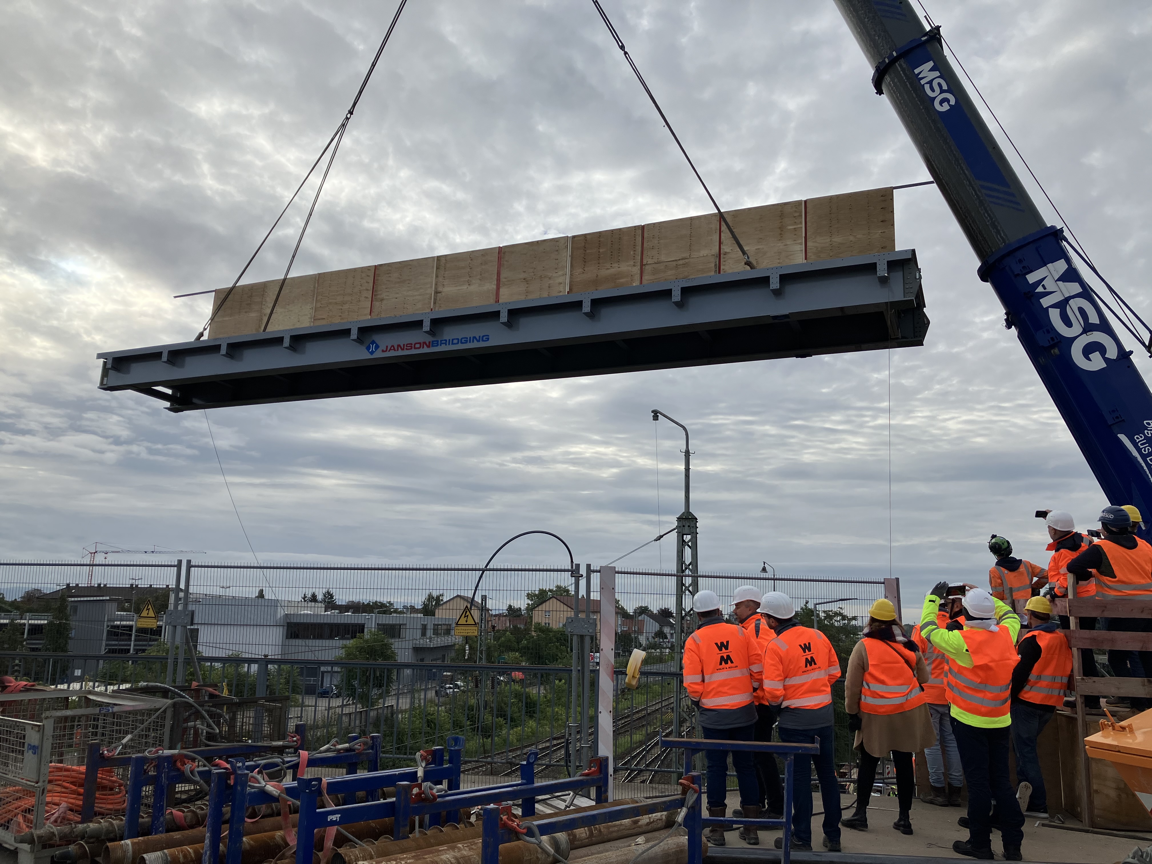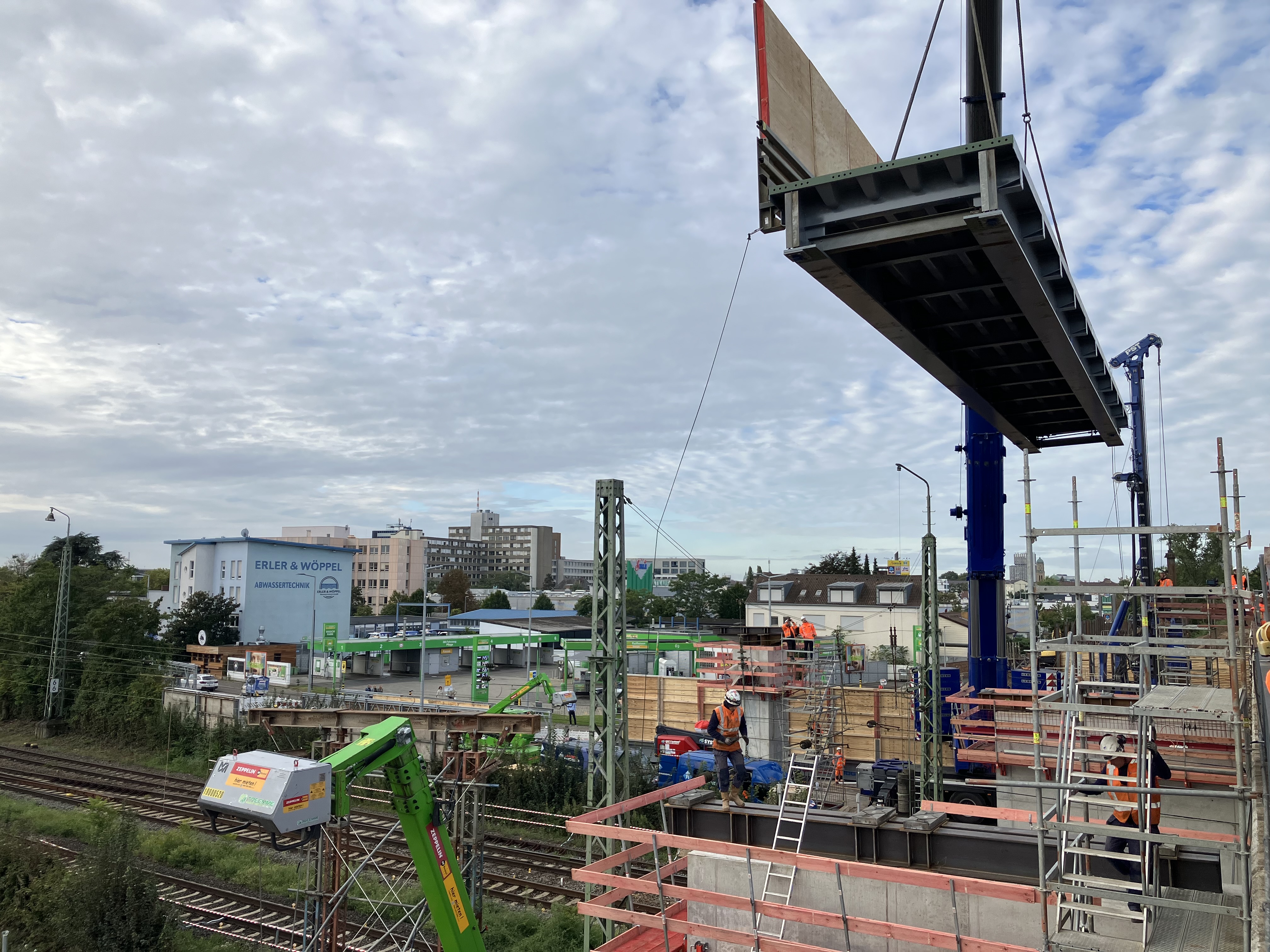 Am Samstag, 14. September, sind die ersten Teile der Behelfsbrücke für die Erneuerung der BBC-Brücke eingehoben worden. Mit einem mobilen Schwerlastkran und zwei Hubsteigern wurden am Vormittag insgesamt drei Brückenteile über den DB-Gleisen der östlichen Riedbahn platziert. Die Teile der Behelfsbrücke wiegen insgesamt rund 96 Tonnen (jeweils ca. 35 Tonnen für die beiden Straßenbrückenteile und ca. 26 Tonnen für die Fuß- und Radwegbrücke).
