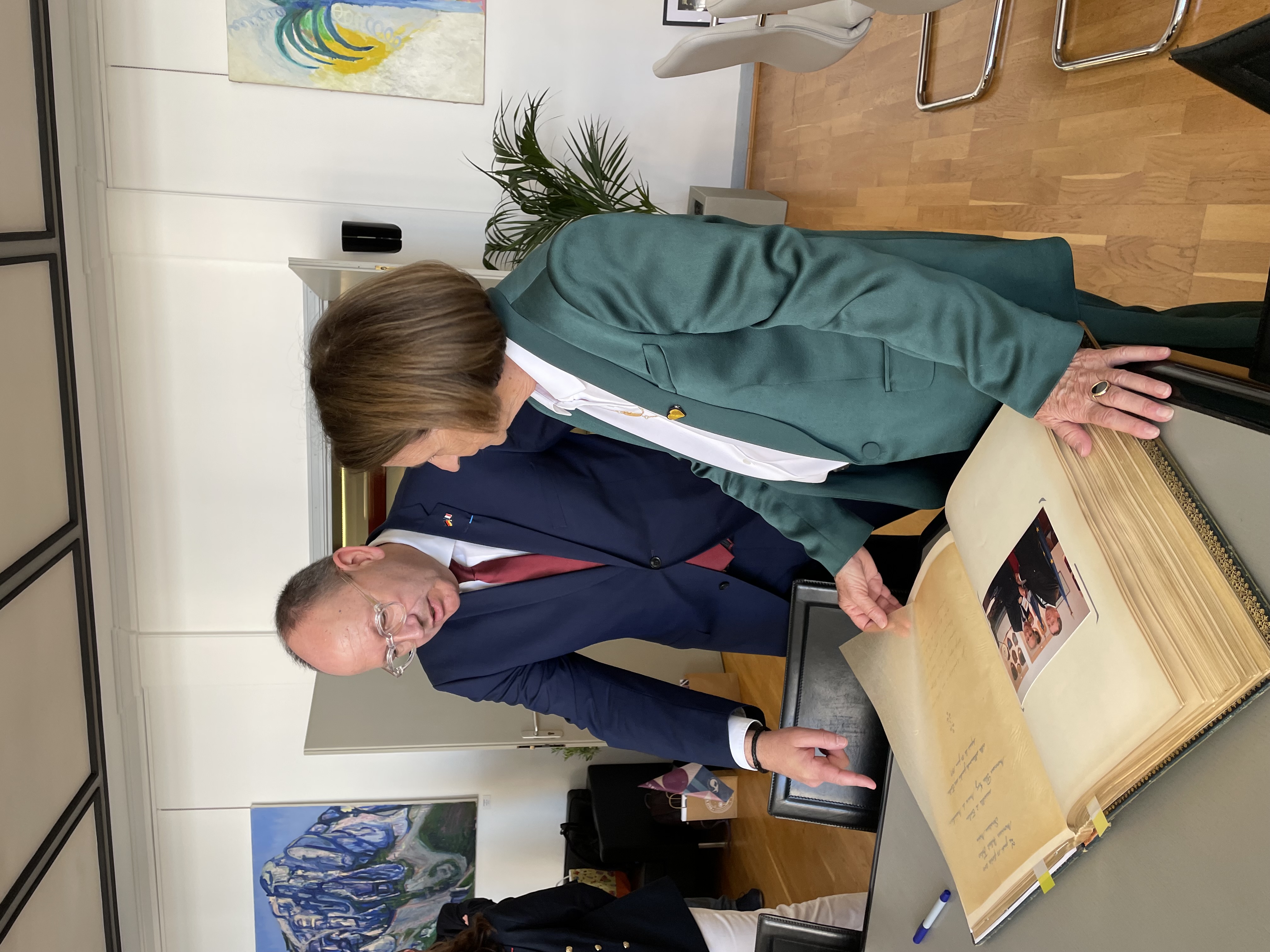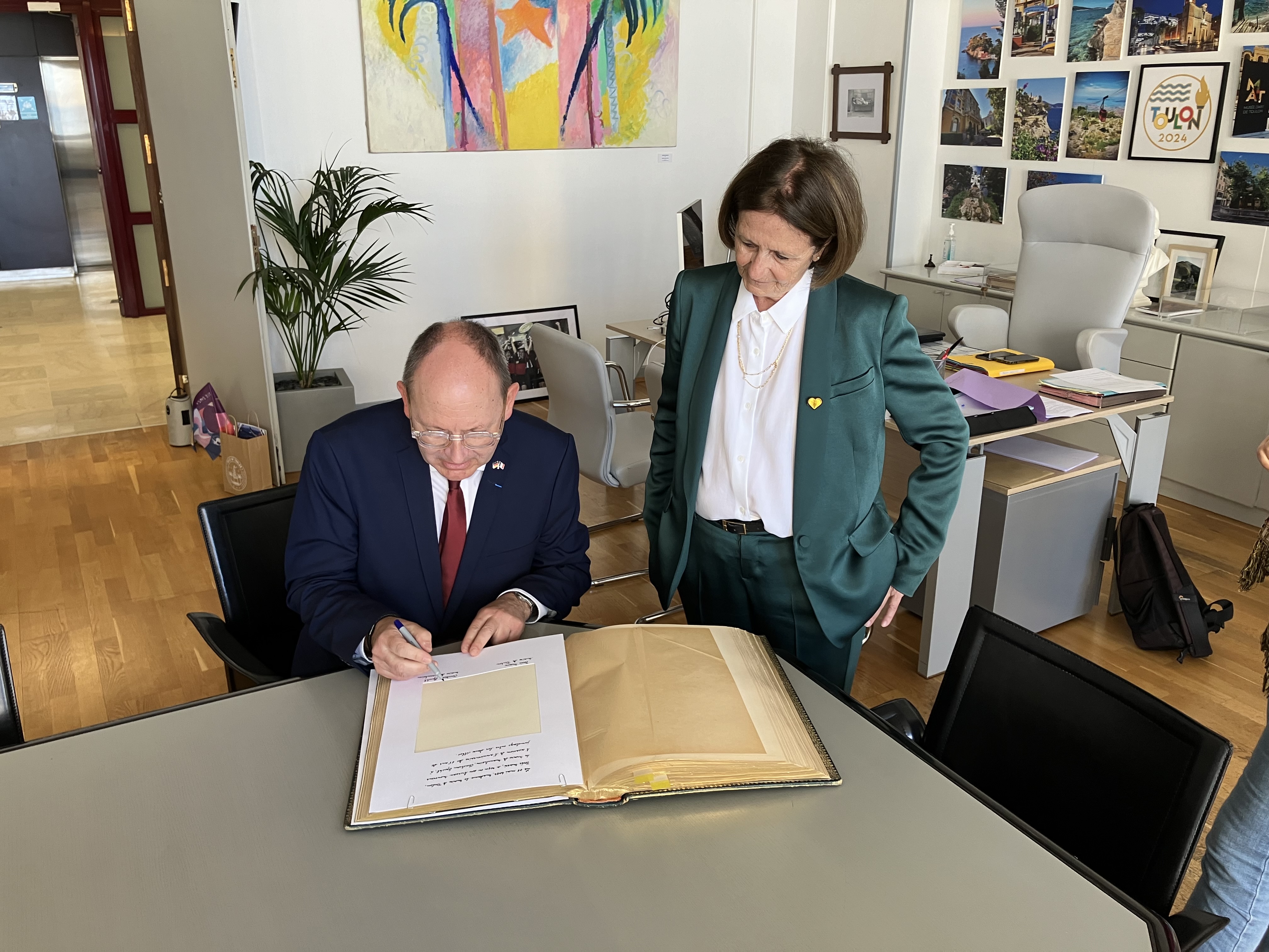 Die seit 2023 amtierende Oberbürgermeisterin Toulons, Josée Massi, empfing Christian Specht am Vormittag des 8. Mai im Rathaus. Zu diesem Anlass trug sich Specht in das goldene Buch der Stadt ein. Massi überreichte eine Gedenkmedaille zur 65-jährigen Partnerschaft mit Mannheim. „Der Austausch mit Frau Massi war intensiv und von Anfang an sehr offen und freundschaftlich“, konstatierte OB Specht. „Wir haben dieselbe Perspektive auf die deutsch-französische Freundschaft und die wichtige Partnerschaftsarbeit zwischen unseren Kommunen.“ Beide Stadtoberhäupter legen einen Schwerpunkt auf die Förderungen des deutsch-französischen Austausches, insbesondere unter jungen Leuten. So machte Josée Massi, ehemals Lehrerin für Mathematik, deutlich: „Die Zukunft gehört der Generation, die heute nicht größer als ein Meter ist.“
