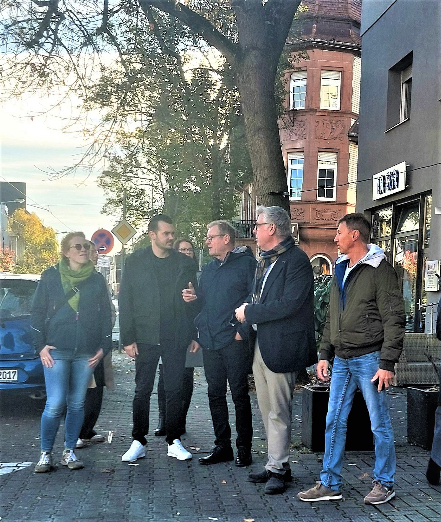 Im Anschluss daran führte der Rundgang zur Feudenheimer Hauptstraße, wo die örtliche Nahversorgung im Fokus stand. Während des ausführlichen Austauschs in der Metzgerei Trautmann und der Buchhandlung Waldkirch wurden die Belange kleinstrukturierter Betriebe deutlich. Besonders wichtig sei eine Vielfalt an Geschäften und gemeinsamen Aktionen, die den Stadtteil beleben und diesen attraktiv halten, brachten Barbara Waldkirch („Wir sind ein niederschwelliges soziales Angebot. Wir brauchen Aktivitäten.“) und Horst Trautmann („Die Einkaufsstraße darf nicht erodieren. Wir müssen die Leute auf die Gass‘ bringen) zum Ausdruck. Bürgermeister Riehle unterstützte das Ansinnen, verwies aber auch auf die Verantwortung der Immobilieneigentümer bei Neuvermietungen.