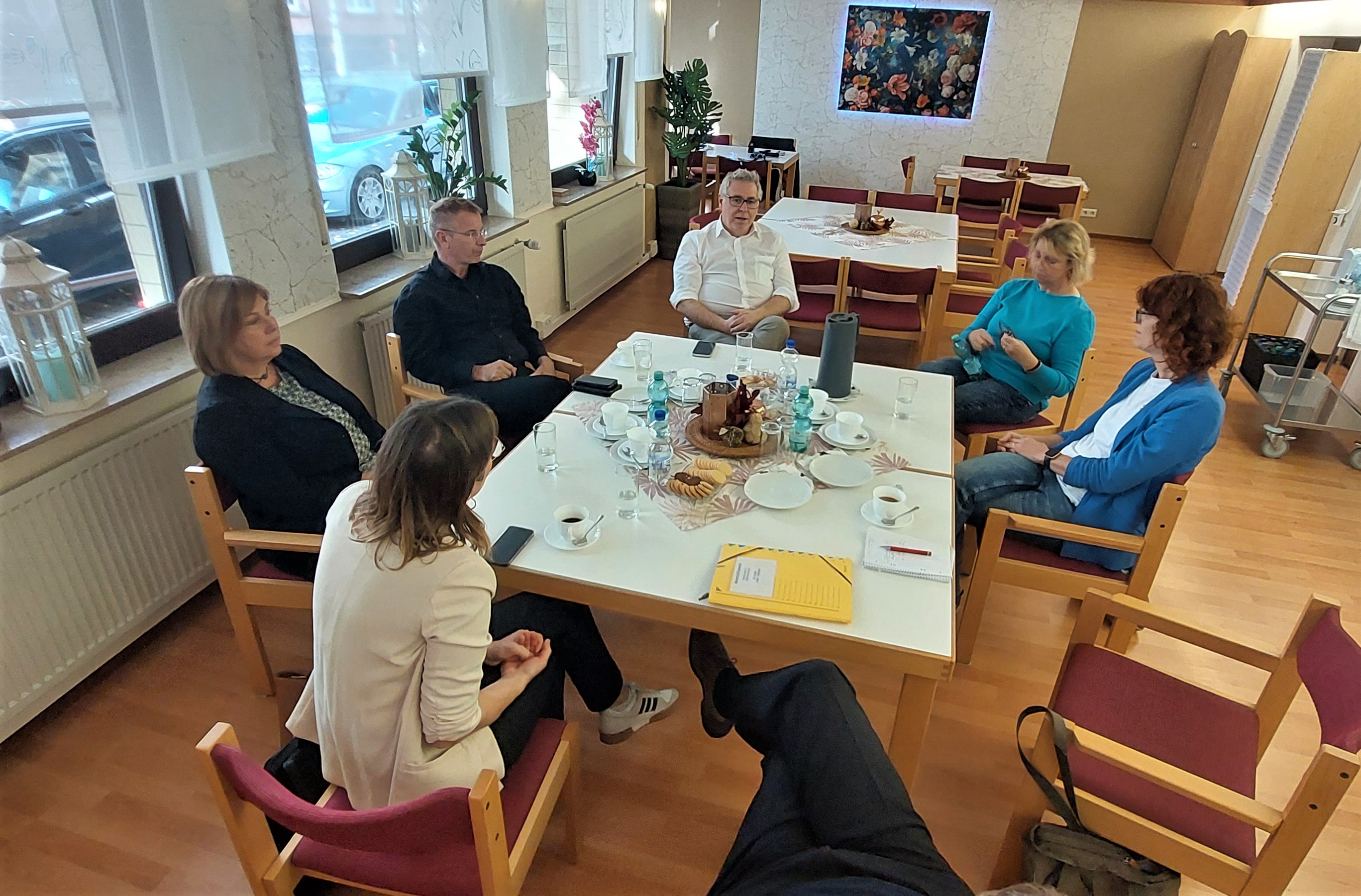 Der anschließende Ortwechsel zum Seniorenpflegeheim der Theodor-Fliedner-Stiftung bildete zugleich den thematischen Sprung hin zum Sozialen. Bei einem Rundgang durch das Gebäude und das weitläufige Gartenareal stellten Geschäftsführer Marcus Miertsch und Betriebsleiter Andreas Schulmeister gemeinsam mit ihrem Team das 1999 eröffnete hundert Plätze umfassende Seniorenpflegeheim, die aktuell im Umbau befindliche Tagespflegeplätze sowie die Anlage für Betreutes Wohnen vor. Bürgermeister Riehle war beeindruckt über die Aktivitäten der Einrichtung, die die Fliedner Stiftung für und mit den Bewohner*innen organisiert: „Die Fliedner Stiftung fördert das soziale Miteinander und die soziale Anbindung ihrer Bewohner*innen. Das wird hier gelebt und macht die Besonderheit des Hauses aus.“
