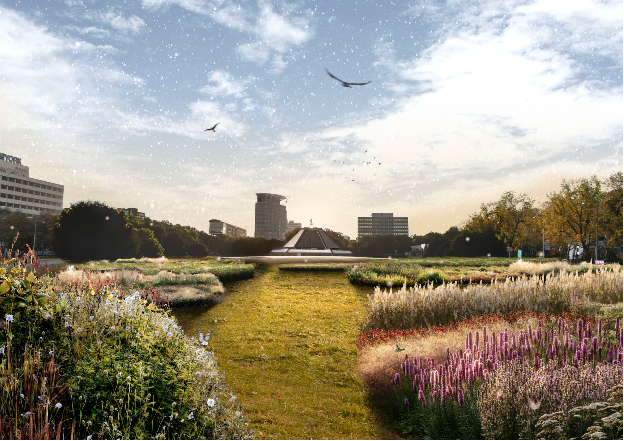 Ein Entwurf legt dabei den Fokus auf eine bunte Stadtnatur, die sich durch Staudenmischpflanzungen und Wildblumenwiese jahreszeitentypisch als Pendant zum von Schmuckpflanzen geprägten Friedrichsplatz darstellt. Der zweite Siegerentwurf versteht den Platz als zusammenhängende Wiesenfläche, und strukturiert diesen mit unterschiedlichen Geländehöhen in Kombination mit Baumpflanzungen.