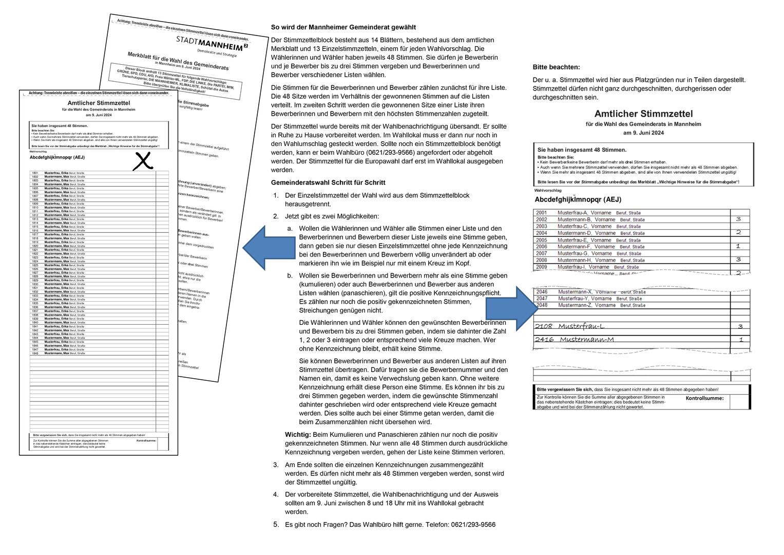 Am Sonntag, 9. Juni, werden die Abgeordneten für das Europaparlament aus Deutschland und der Mannheimer Gemeinderat für fünf Jahre neu gewählt. Wahlberechtigte haben eine Wahlbenachrichtigung erhalten. Wahlberechtigte für die Gemeinderatswahl haben auch den Stimmzettelblock erhalten, den sie schon zu Hause vorbereiten sollten. Schließlich können bis zu 48 Stimmen vergeben werden. Ins Wahllokal muss der Ausweis oder der Reisepass mitgebracht werden, die Wahlbenachrichtigung sollte vorgelegt werden – das erleichtert die Stimmabgabe. Wenn die Wahlbenachrichtigung nicht greifbar ist, kann auch nur mit dem Ausweis oder dem Reisepass gewählt werden.