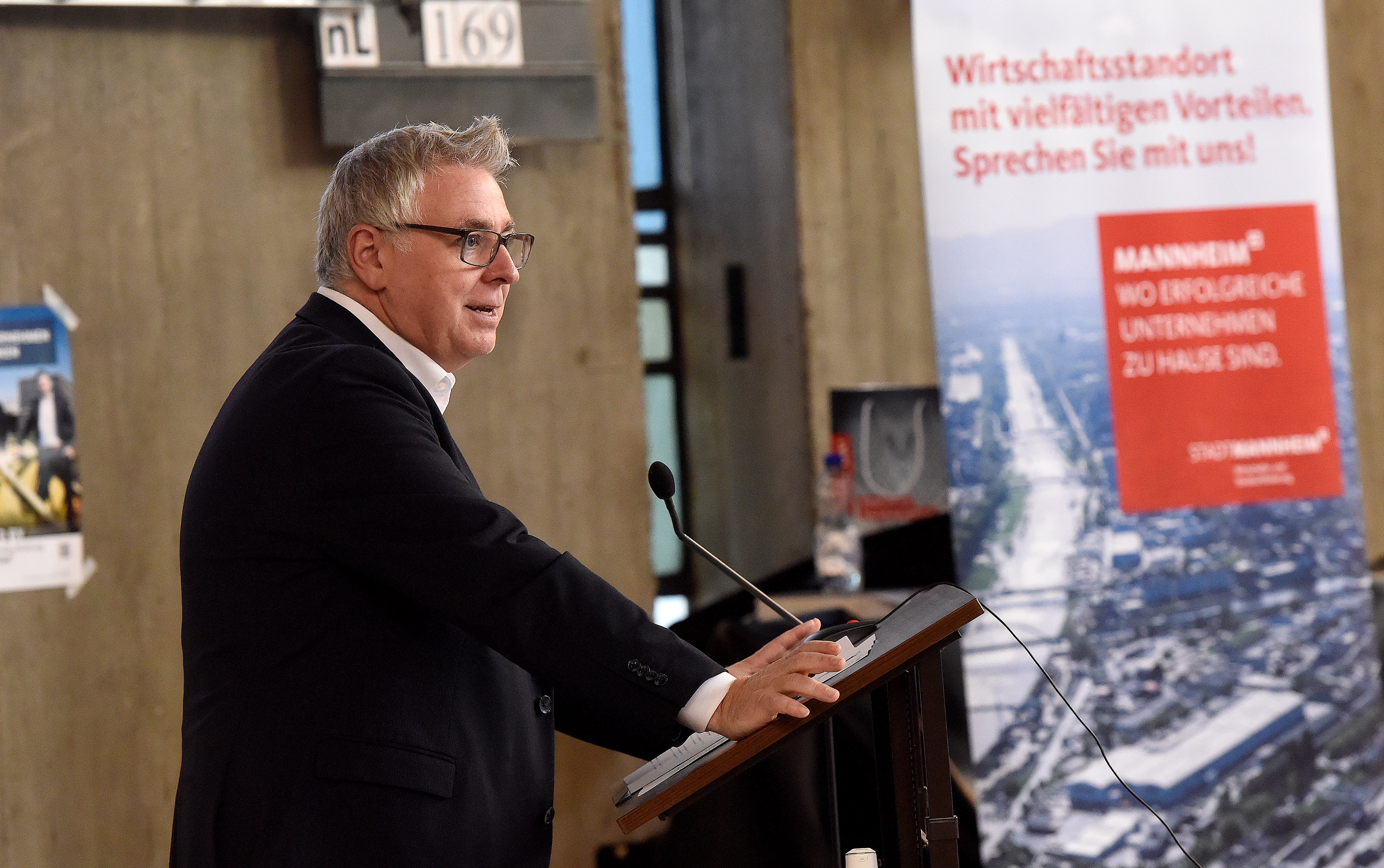 Mit den Gewerbeforen hat der Fachbereich für Wirtschafts- und Strukturförderung ein Veranstaltungsformat reaktiviert, das es unter dem Titel „Gewerbegebietsabende“ bereits vor Corona gab. Nach dem Gewerbegebiet Friedrichsfeld im April dieses Jahres hatte man nun in die Rheinauer Versöhnungskirche eingeladen. „Ich freue mich, dass wir uns genau an diesem Ort treffen, an dem auch Kirche neu gedacht wird“, mit diesen Worten begrüßte Wirtschaftsbürgermeister Thorsten Riehle die Gäste. Denn auch das Gewerbeforum beschäftige sich mit der Frage „Wo wollen wir hin?“ „Der Austausch mit Ihnen ist mir und dem Team der Wirtschaftsförderung mit Christiane Ram an der Spitze wichtig. Uns interessiert, was Sie bewegt, und wie wir Dinge besser zusammenbringen können“, sagte Riehle. Er betonte: „Die Stadt lebt in hohem Maß davon, dass Sie unternehmerisch tätig sind – als Arbeitgeber, als Steuerzahler und viele von Ihnen auch ehrenamtlich.“ Daher wolle man den Mannheimer Unternehmen mit dem Gewerbeforum Hilfestellungen zu verschiedenen Themen, wie beispielsweise Klima- und Umweltschutz, Fördermöglichkeiten oder Arbeitskräftegewinnung bieten. „Wir wollen Arbeitgeber*innen und Arbeitnehmer*innen zusammenbringen, wozu auch Fachkräfte aus dem Ausland zählen“, erklärte der Wirtschaftsbürgermeister. „Für uns enorm wichtig ist die Arbeit des FuturRaum. Ein Projekt, das nicht nur die City, sondern auch verschiedene Stadtteile, darunter die Rheinau, einbindet und darauf ausgelegt ist, Stadtteilzentren zu stärken und insbesondere vor dem Hintergrund des demografischen Wandels die Infrastruktur vor Ort zu erhalten“, so Riehle.