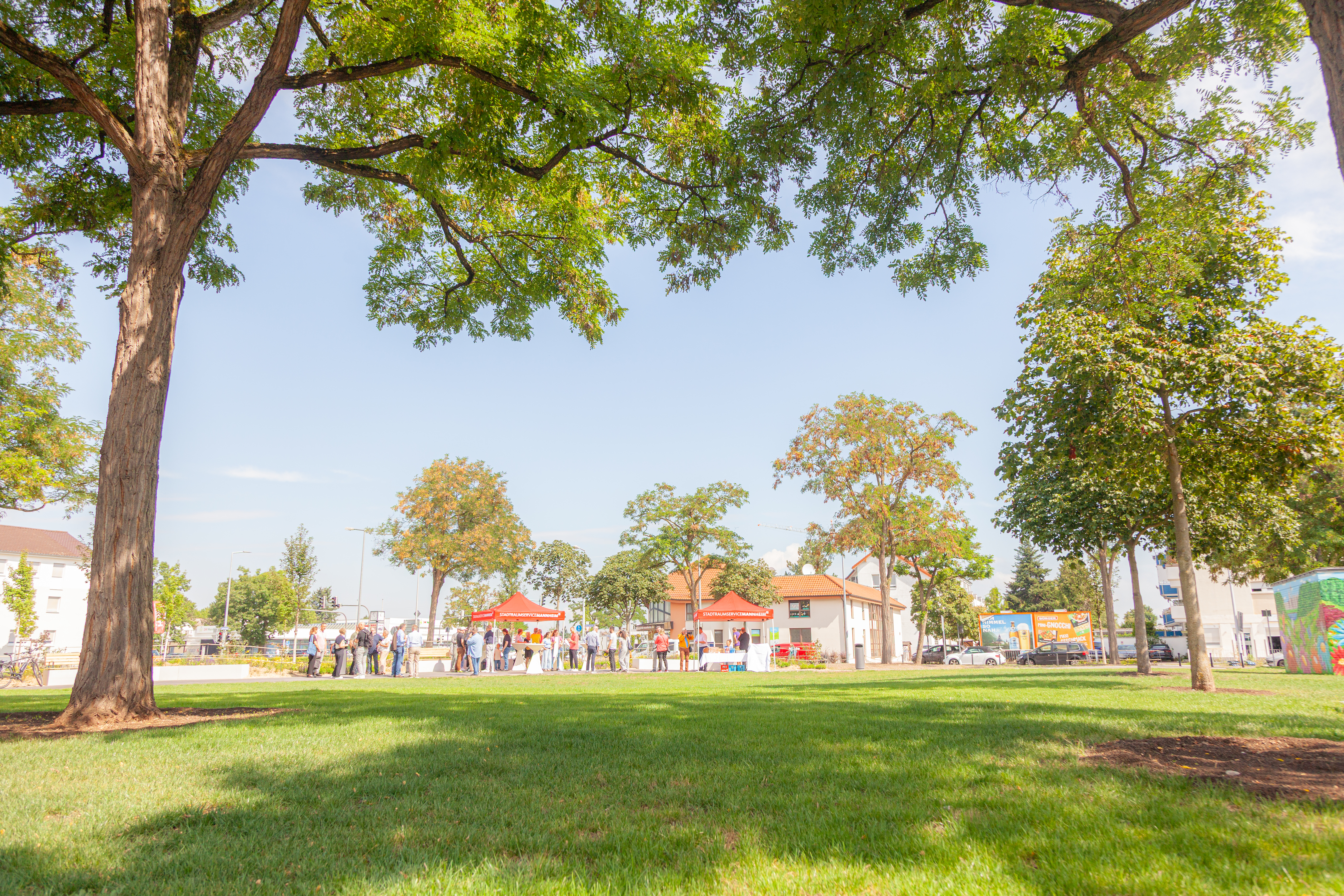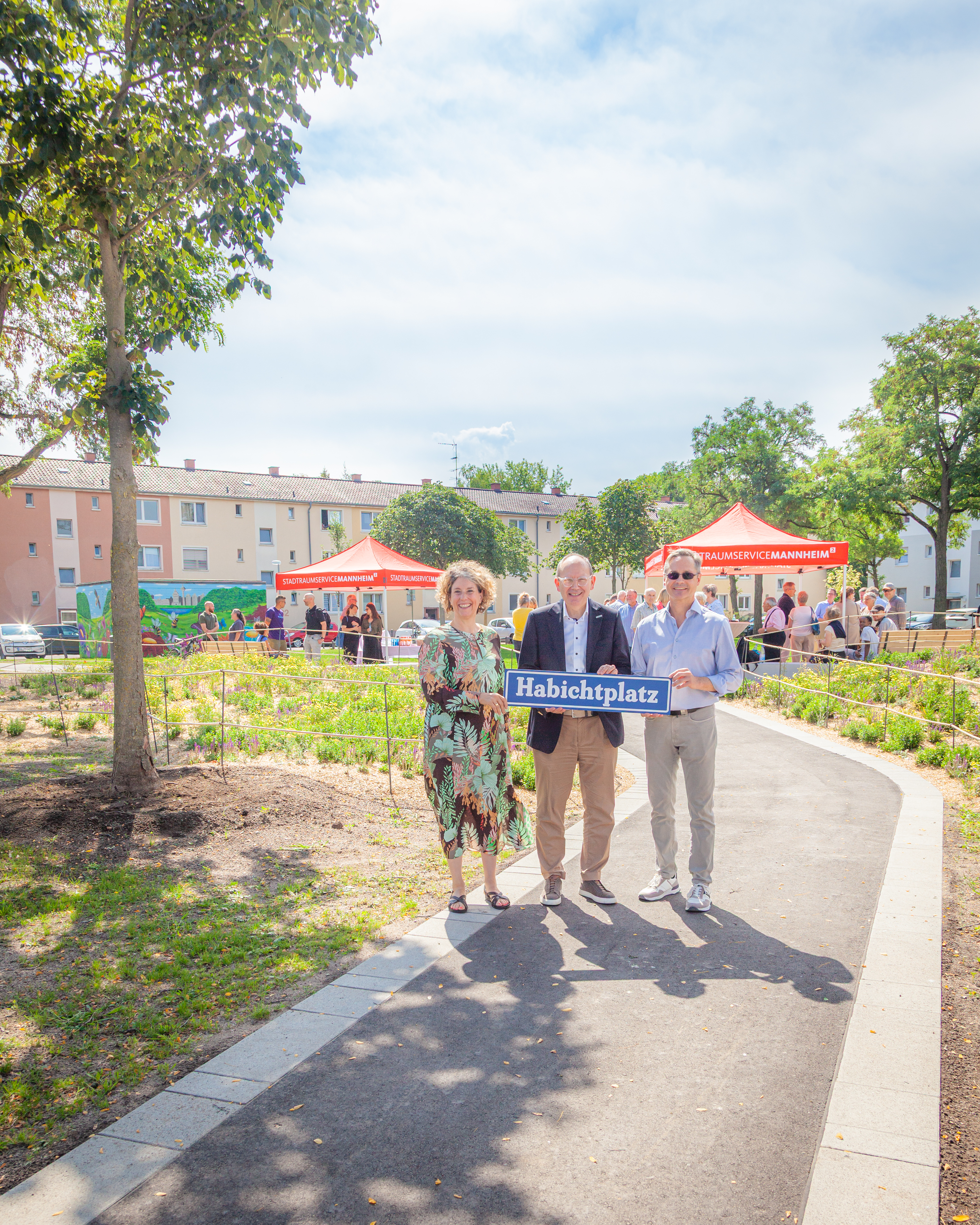 Eine klimawirksame Grünfläche zum Verweilen mitten in Käfertal: Oberbürgermeister Christian Specht hat heute mit Erster Bürgermeisterin Prof. Dr. Diana Pretzell und Bürgermeister Ralf Eisenhauer den neuen Habichtplatz eröffnet. Die Stadt Mannheim hatte den Platz seit November letzten Jahres entsiegelt und neu begrünt.