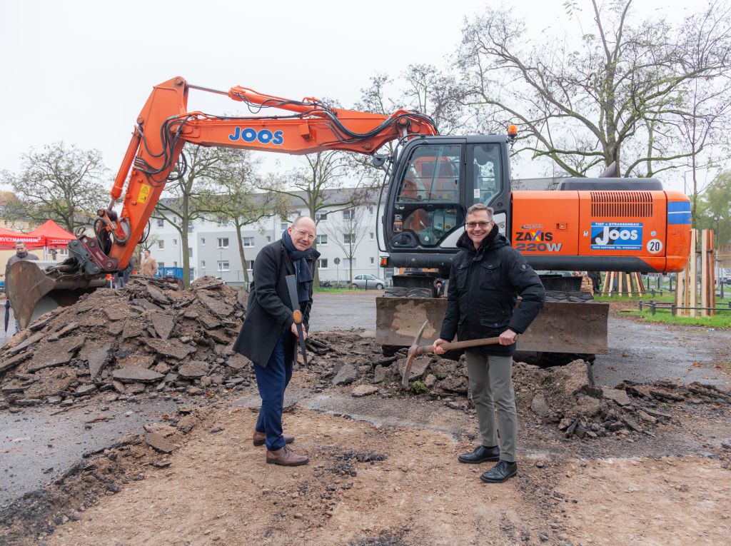 Die Stadt Mannheim macht aus dem versiegelten Habichtplatz in Käfertal eine klimawirksame Grünfläche mit Aufenthaltscharakter. Um die Bauarbeiten symbolisch zu starten, griff Oberbürgermeister Christian Specht heute im Beisein von Bürgermeister Ralf Eisenhauer vor Ort selbst zum Werkzeug. In den kommenden Wochen wird unter anderem die Asphaltdecke entfernt. Bis Frühjahr 2025 soll der Platz dann begrünt werden.