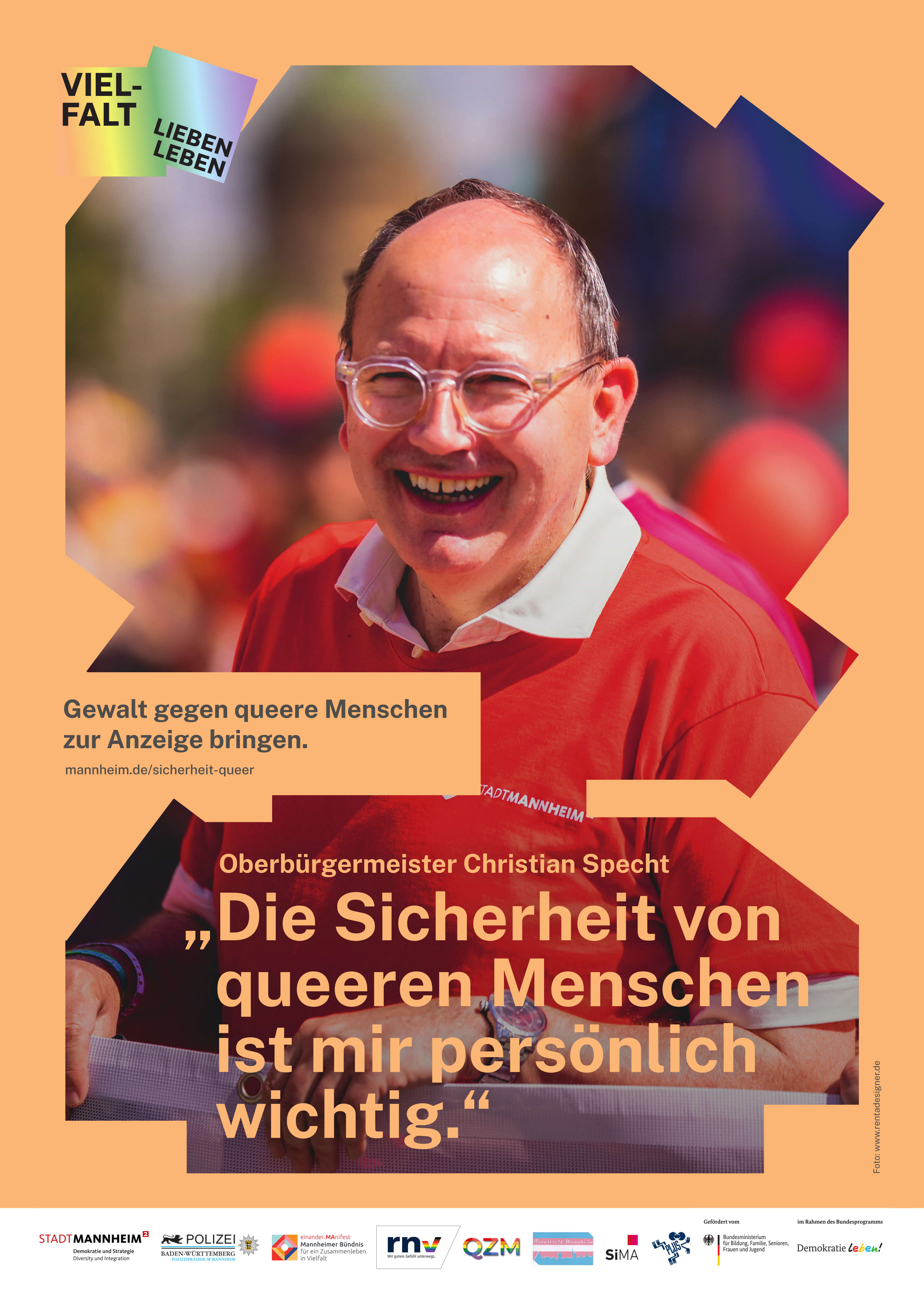 „Die Sicherheit queerer Menschen ist der Stadt Mannheim und mir ganz persönlich ein wichtiges Anliegen. Aus diesem Grund unterstütze ich die Kampagne aktiv“, betont Oberbürgermeister Christian Specht. „Mit der Kampagne setzen wir ein deutliches Zeichen gegen jegliche Form von Diskriminierung und Gewalt und verdeutlichen, dass Mannheim als Stadt geschlossen für Vielfalt, Respekt und Zusammenhalt steht.“