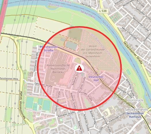 Nach Lageeinschätzung durch den Kampfmittelbeseitigungsdienst müssen Personen und Gebäude in einem Umkreis von 450 Metern um die Fundstelle evakuiert werden. Der Evakuierungsradius ist in der Grafik zu sehen. Die Polizei hat mit der Räumung bereits begonnen. Für betroffene Bürgerinnen und Bürger wurde in der Richard-Möll-Halle (Innerer Heckweg 5, 68239 Mannheim) in Seckenheim eine Anlaufstelle eingerichtet.