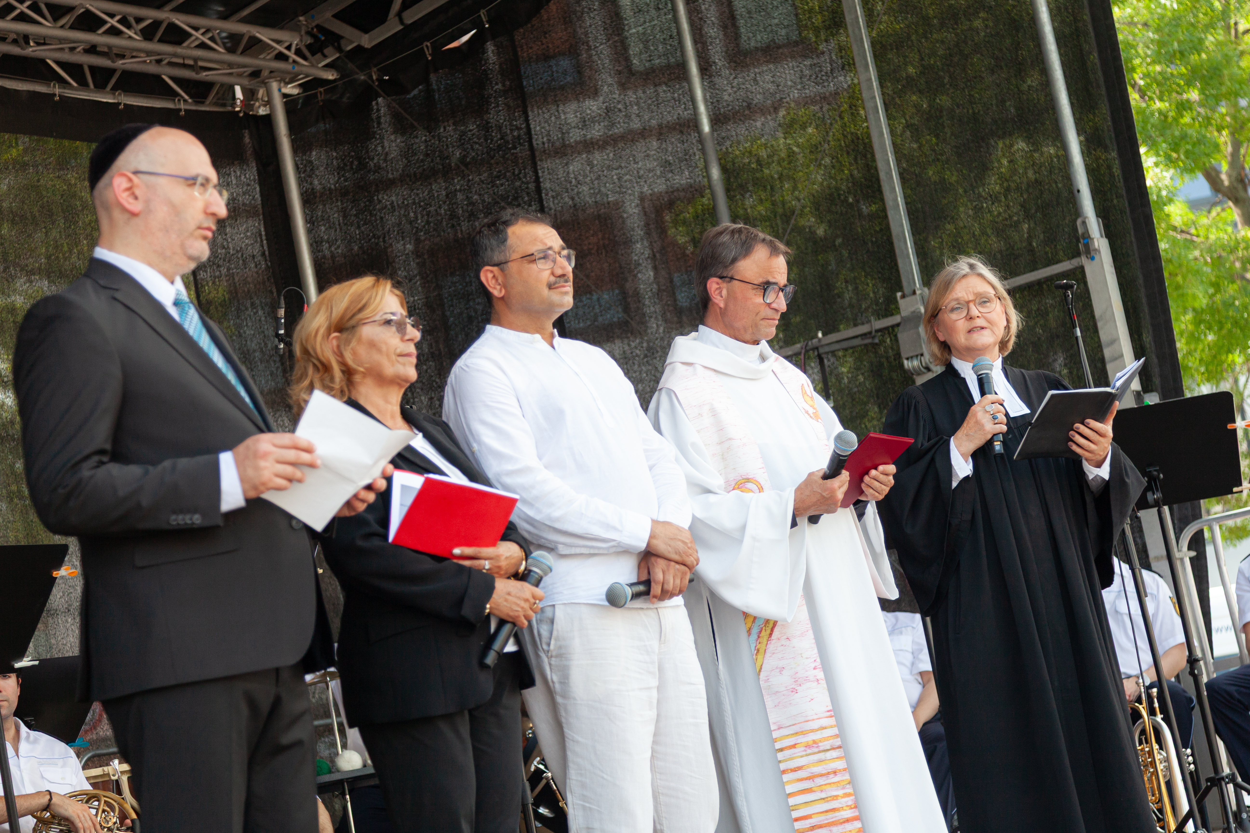 Den emotionalen Redebeiträgen folgte ein vom Mannheimer Forum der Religionen gestaltetes interreligiöses Friedensgebet. Darin riefen Vertreter der christlichen Kirchen, der jüdischen, alevitischen und muslimischen Gemeinden zu Toleranz und respektvollem Miteinander auf. Begleitet von Glockenschlägen enthüllten zwei Mannheimer Polizeibeamte einen neu geschaffenen „Stadtpunkt“ – eine gemeinsam vom MARCHIVUM, der Stadt Mannheim und der Polizei konzipierte Glasstele, die über die Ereignisse des 31. Mai 2024, das Leben und die Werte von Rouven Laur informiert. Dort legten die Minister, der Oberbürgermeister, die Landespolizeipräsidentin Dr. Stefanie Hinz, die Mannheimer Polizeipräsidentin Ulrike Schäfer mit zahlreichen Vertreterinnen und Vertretern der Stadtgesellschaft weiße Rosen als Zeichen des Gedenkens und der Trauer nieder.