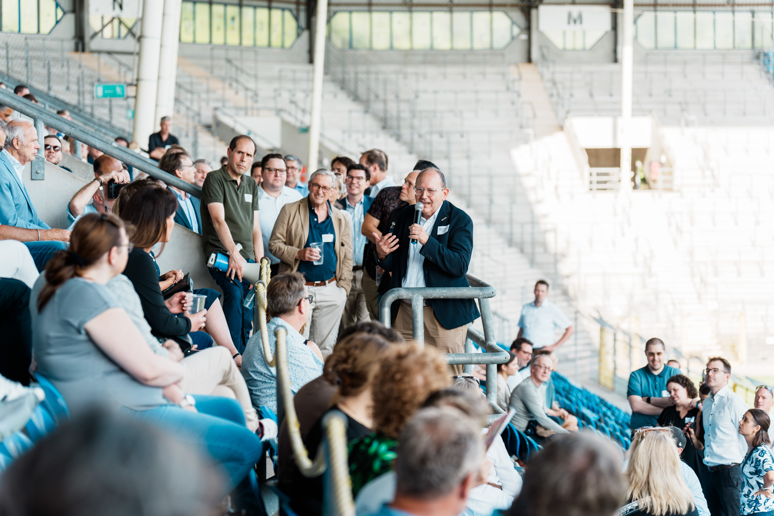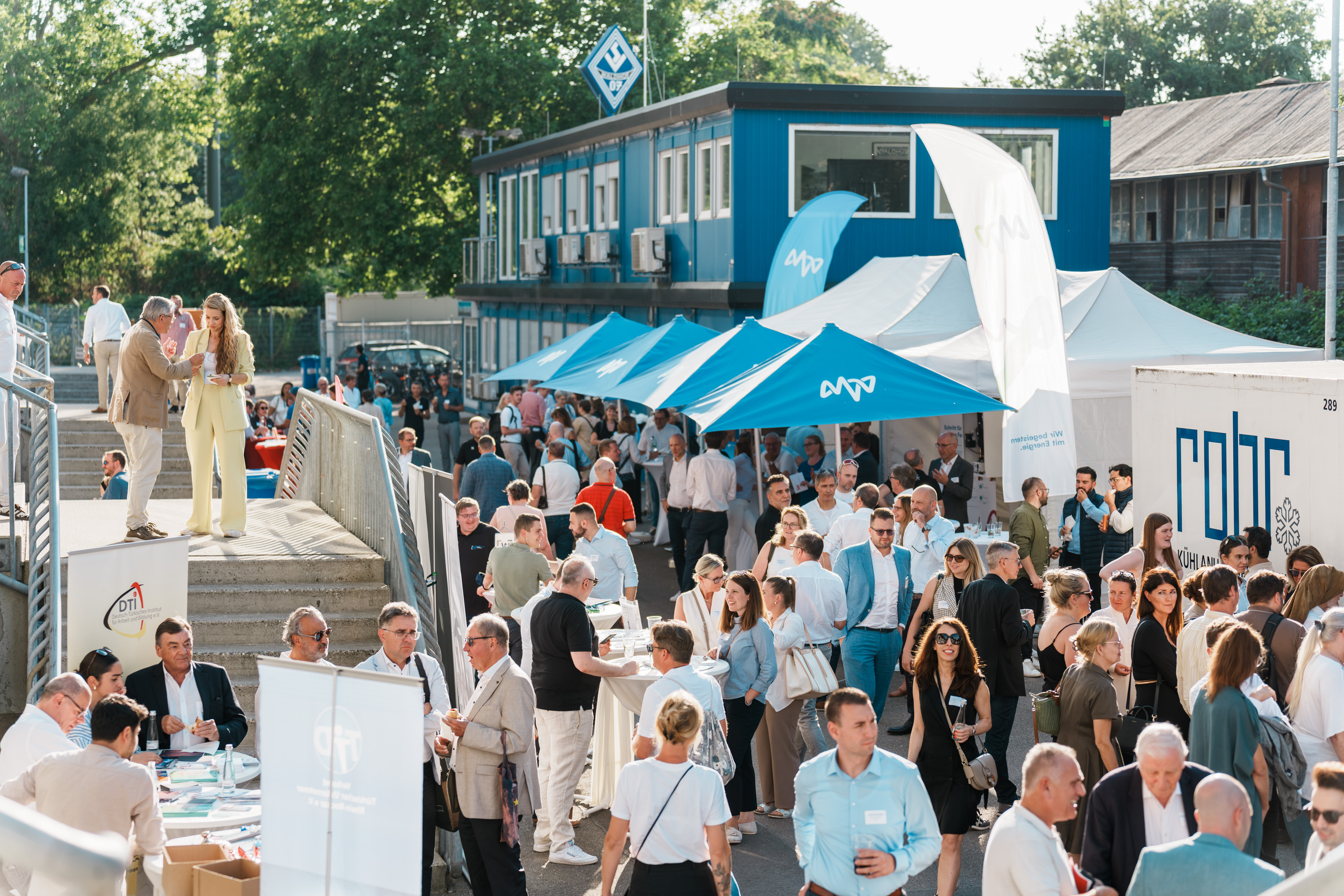 Krisen gehören längst zum Geschäftsalltag – entscheidend ist, wie man mit ihnen umgeht. „Wie Widerstandskraft zum Erfolgsfaktor werden kann und welche Perspektiven es zu entdecken gilt, darüber diskutierten Fachleute, Unternehmerinnen und Unternehmer sowie regionale Akteurinnen und Akteure beim Mannheimer Gewerbeforum 2025, das der Fachbereich für Wirtschafts- und Strukturförderung der Stadt Mannheim erstmalig in Kooperation mit dem SV Waldhof Mannheim veranstaltete. Zur Premiere des neuen Formats kamen mehr als 400 Teilnehmende in das Carl-Benz-Stadion. Flankiert wurde das Programm von einem "Marktplatz", auf dem sich rund zwei Dutzend Institutionen und Initiativen aus der Region mit ihren Dienstleistungen und Ideen präsentierten. Der Veranstaltung vorausgegangen waren zahlreiche kleinere stadtteilbezogene Gewerbeforen – und die Erkenntnis, dass viele Themen, die kleine und mittlere Unternehmen bewegen, unabhängig von ihrem Standort sehr ähnlich sind und ein Bedarf an Vernetzung und Wissenstransfer besteht. In sommerlicher Atmosphäre, musikalisch begleitet von „Rolf Stahlhofen & Band“ und bei Imbiss und Getränken des SV Waldhof bot das Gewerbeforum den Teilnehmenden Gelegenheit zum Netzwerken und Austausch.