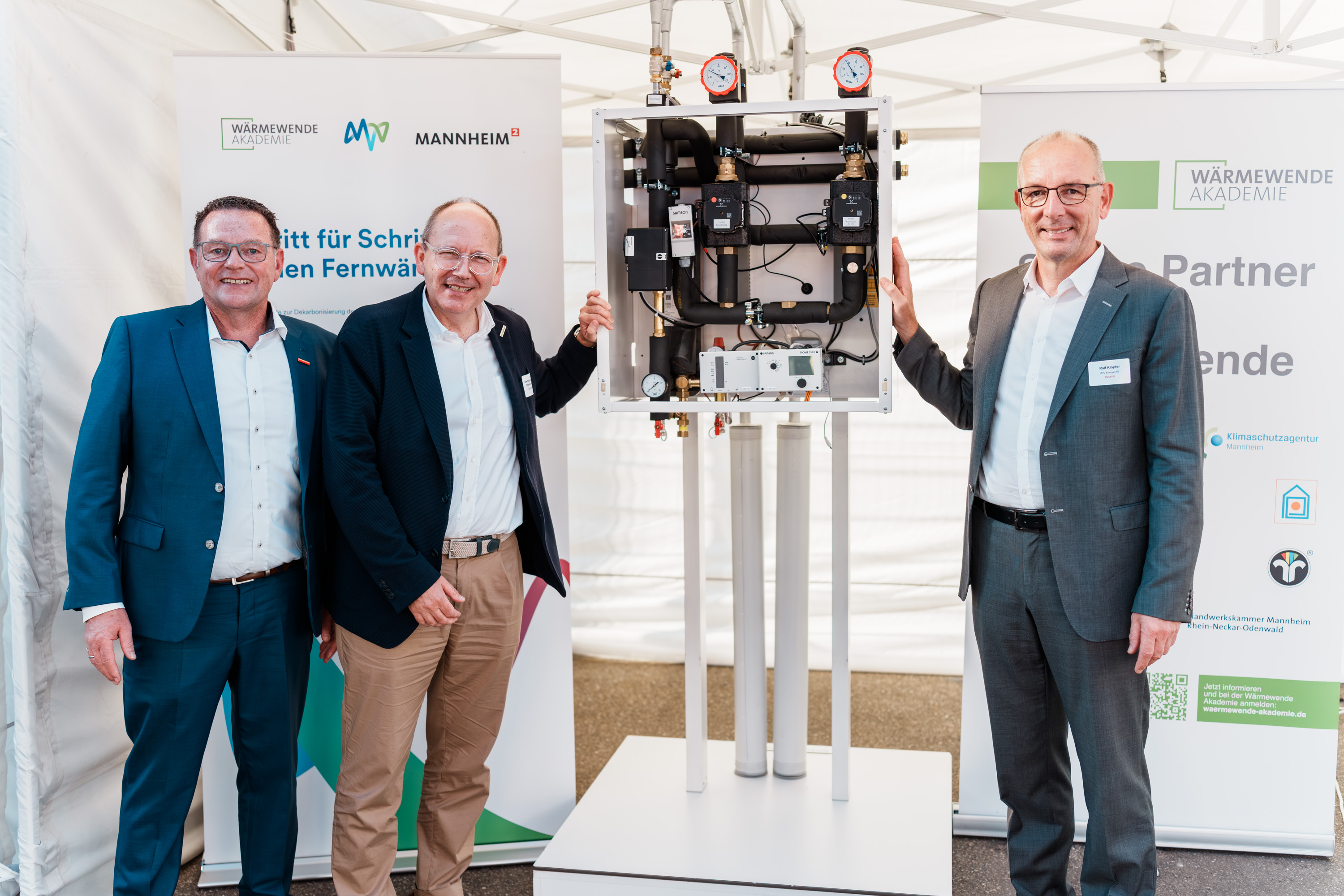 Einen weiteren Programmpunkt der Veranstaltung bildete die Wärmewendeakademie. Oberbürgermeister Christian Specht, der Präsident der Handwerkskammer Mannheim Rhein-Neckar Odenwald, Klaus Hofmann, sowie MVV-Vertriebsvorstand Ralf Klöpfer stellten dieses bundesweit einzigartige Kooperationsprojekt von Stadt Mannheim, Klimaschutzagentur, Handwerkskammer, Industrie- und Handelskammer, den Innungen von Sanitär- und Heizung, Elektro, Stuckateuren und Schornsteinfegern sowie der MVV vor. Ziel der Akademie ist es, möglichst viele Handwerksbetriebe so fortzubilden, dass sie die ihre Kunden bei den notwendigen Maßnahmen für die Wärmewende optimal beraten können – zum Beispiel der Installation von Wärmepumpen oder Fernwärmestationen. Auch Informationen zu aktuellen Förder- und Finanzierungsmöglichkeiten gehören zum Schulungsprogramm. 98 Fachleute aus 81 Betrieben wurden bereits geschult. Mit der Übergabe von je einer Fernwärmeübergabestation zu Schulungszwecken an die Bildungsakademie des Handwerks sowie die Heinrich-Lanz-Berufsschule wurden weitere Partner in das Projekt aufgenommen.