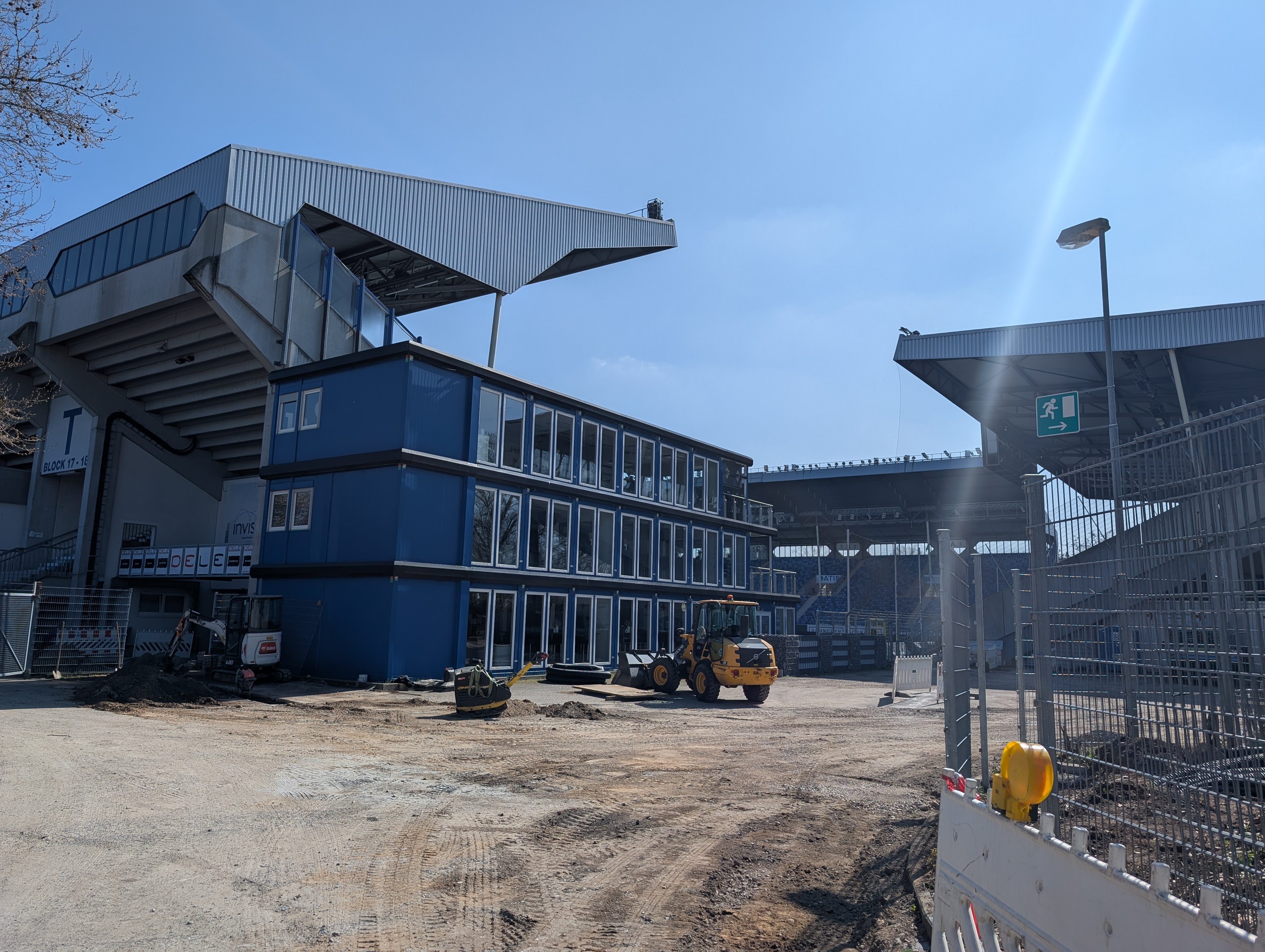 In diesem Zusammenhang werden Leitungen für die neue Flutlichtanlage verlegt und die Stellfläche für die vom DFB geforderte Ersatzstromversorgung des Flutlichts wird hergestellt. Die neue Flutlichtanlage wird zur Saison 2025/2026 zur Verfügung stehen.