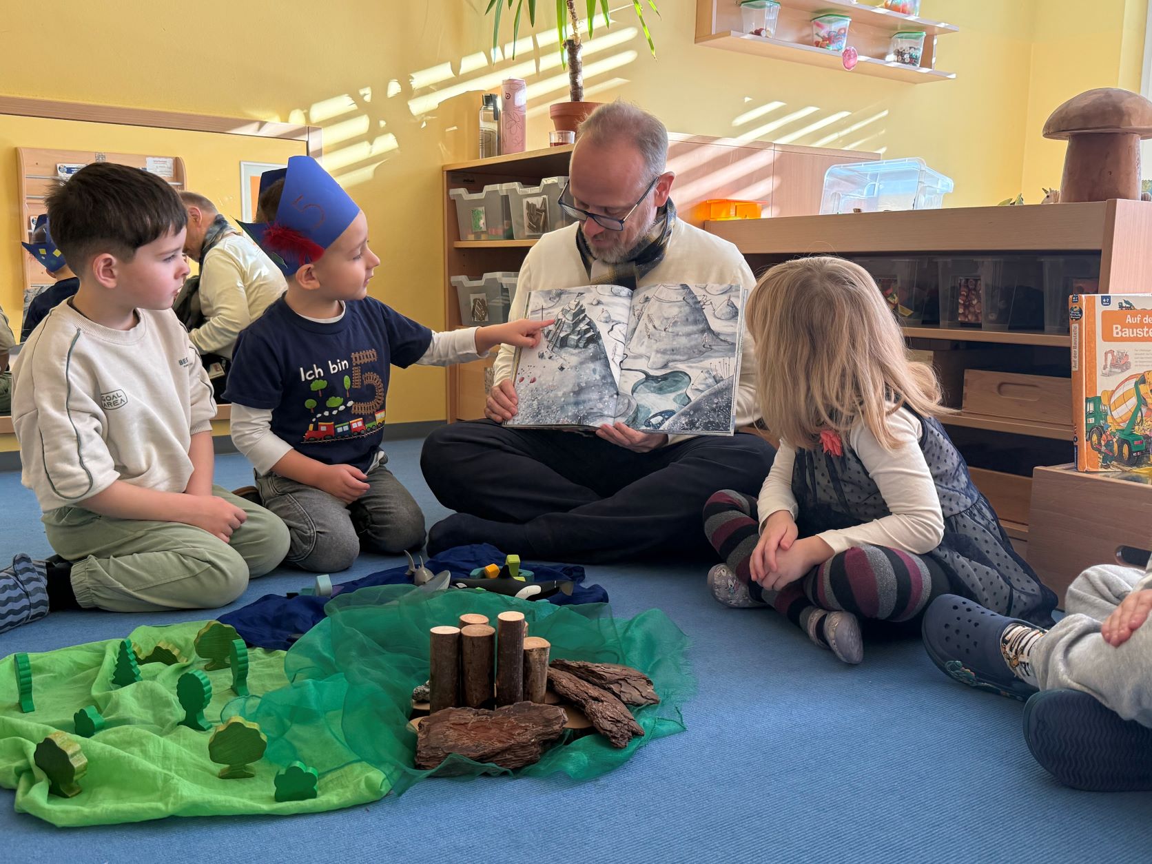 Bildungsbürgermeister Dirk Grunert sowie Andreas Müller, Fachbereichsleiter der städtischen Kindertageseinrichtungen, übernahmen in diesem Jahr die zentralen Lesebeiträge. Bürgermeister Grunert las aus dem Bilderbuch „Der Berg“ von Rebecca Gugger und Simon Röthlisberger und nahm die Kinder mit auf eine poetische Reise voller Neugier und Mut.