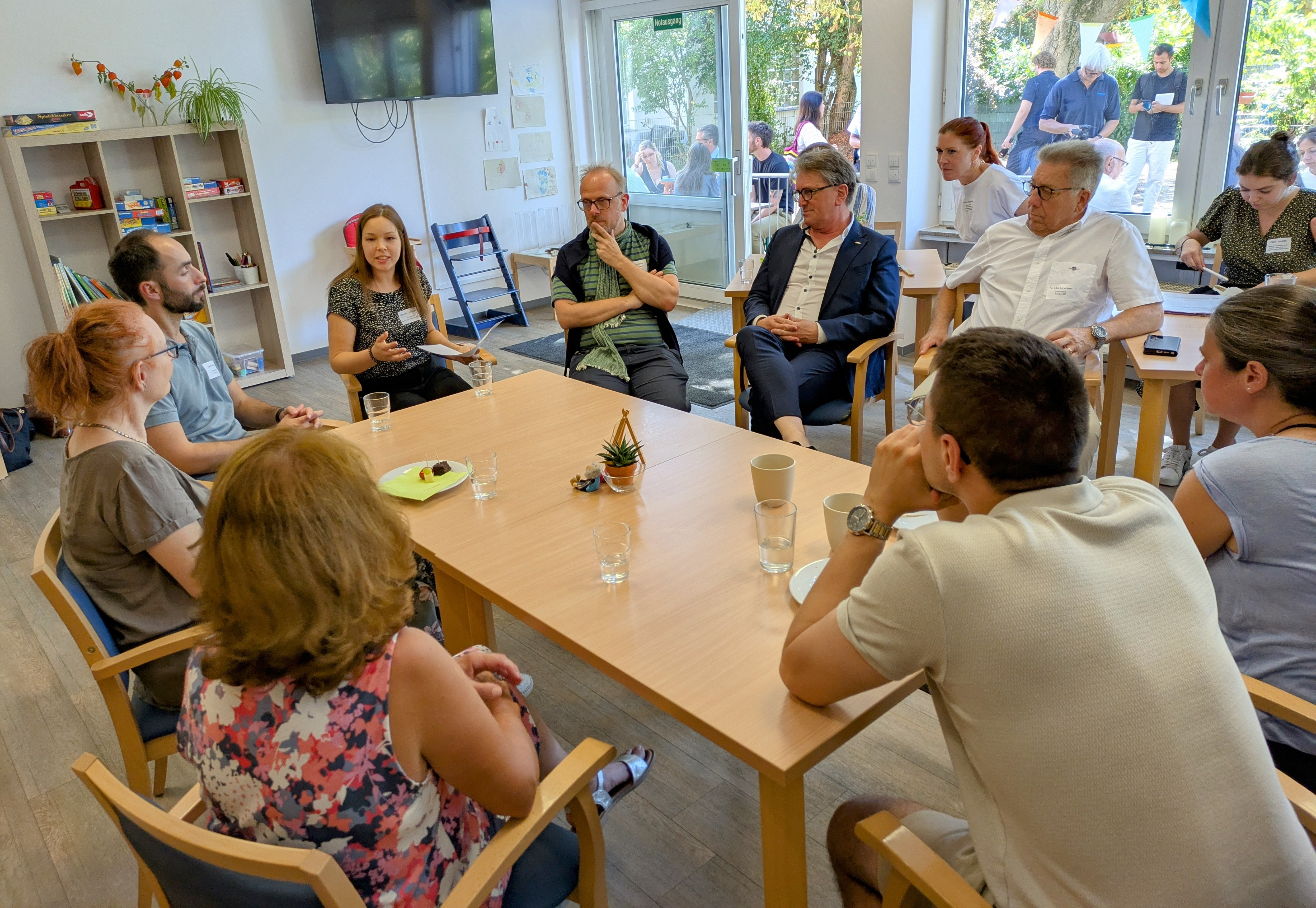 Ein Schwerpunkt des Besuchs von Gesundheitsminister Lucha war der direkte Austausch mit Kooperationspartner*innen im Speed-Dating-Format. Diskutiert wurde dabei die Rolle des Gesundheitscafés als Begegnungsort im Stadtteil, Anlaufstelle für Anliegen rund um Gesundheit und Teilhabe sowie Impulsgeber für Gesundheitsförderung im Quartier.