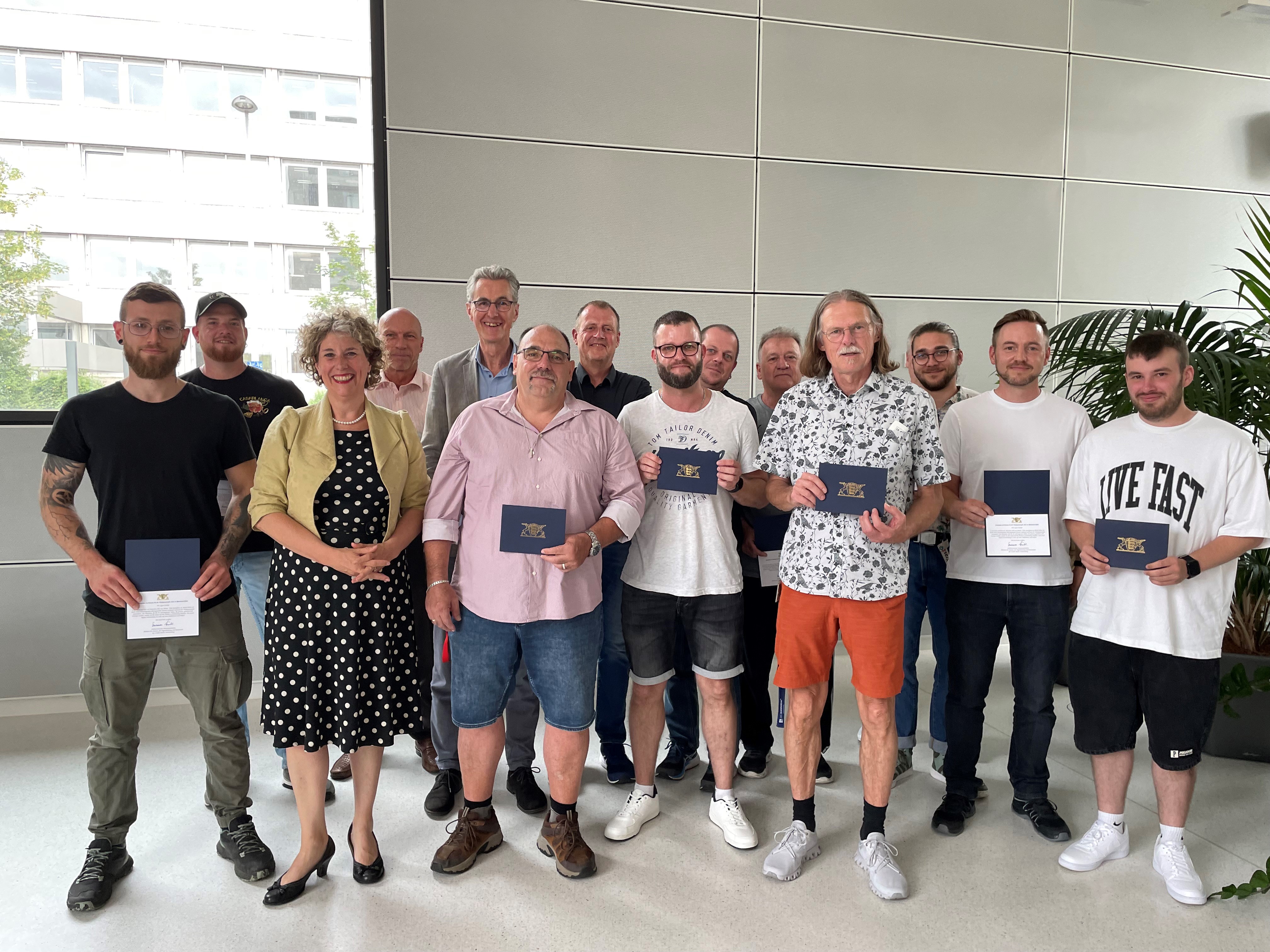 Im Rahmen einer Betriebsstättenversammlung wurden gestern Mitarbeiter der Stadtentwässerung Mannheim für ihre Arbeit bei der Flutkatastrophe im Ahrtal 2021 geehrt. Erste Bürgermeisterin, Prof. Dr. Diana Pretzell übergab zwölf der insgesamt 22 Helfern eine Urkunde, die von Thomas Strobl, stellvertretender Ministerpräsident und Minister des Inneren, für Digitalisierung und Kommunen des Landes Baden-Württemberg, ausgestellt und signiert wurde.