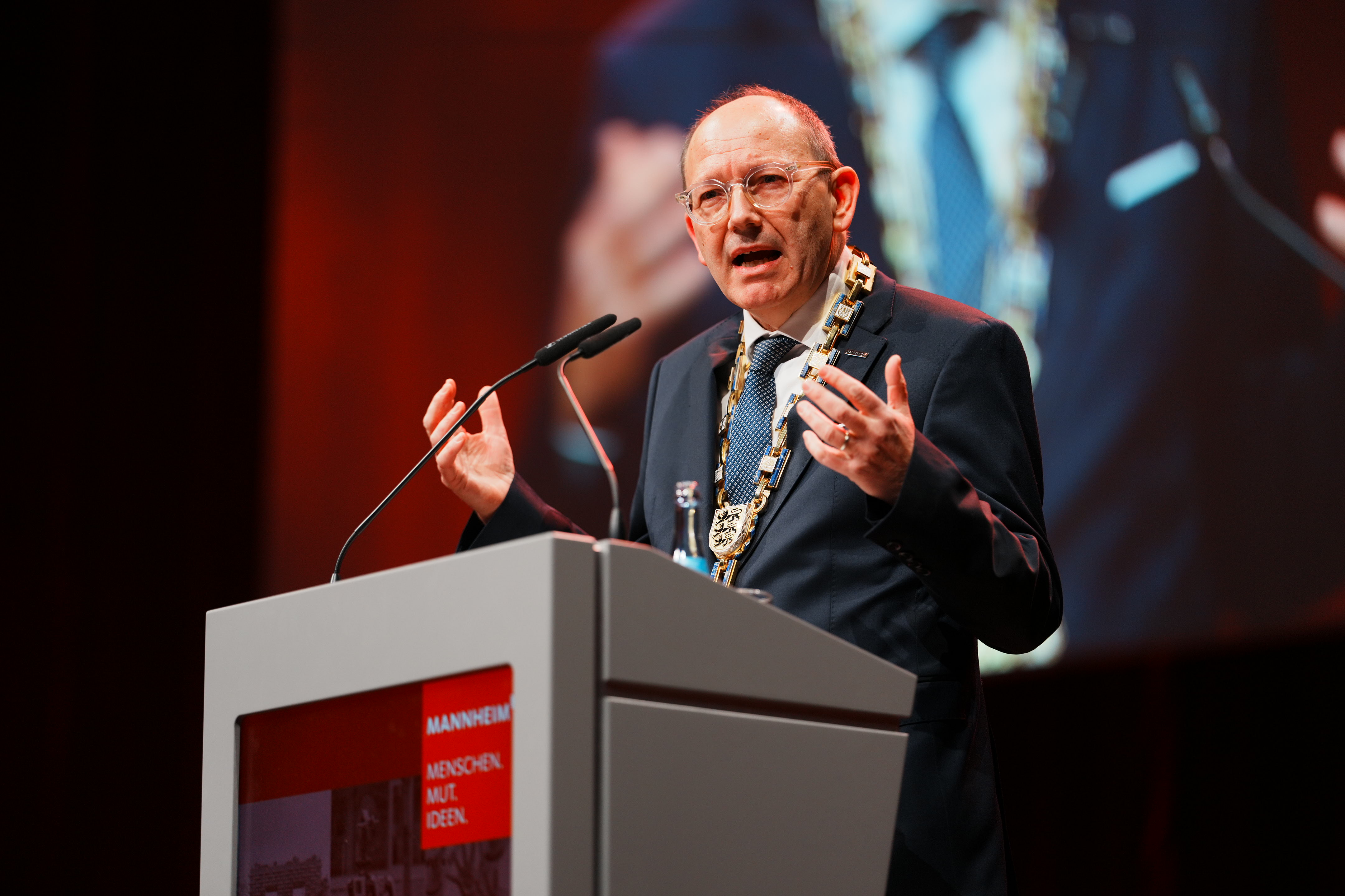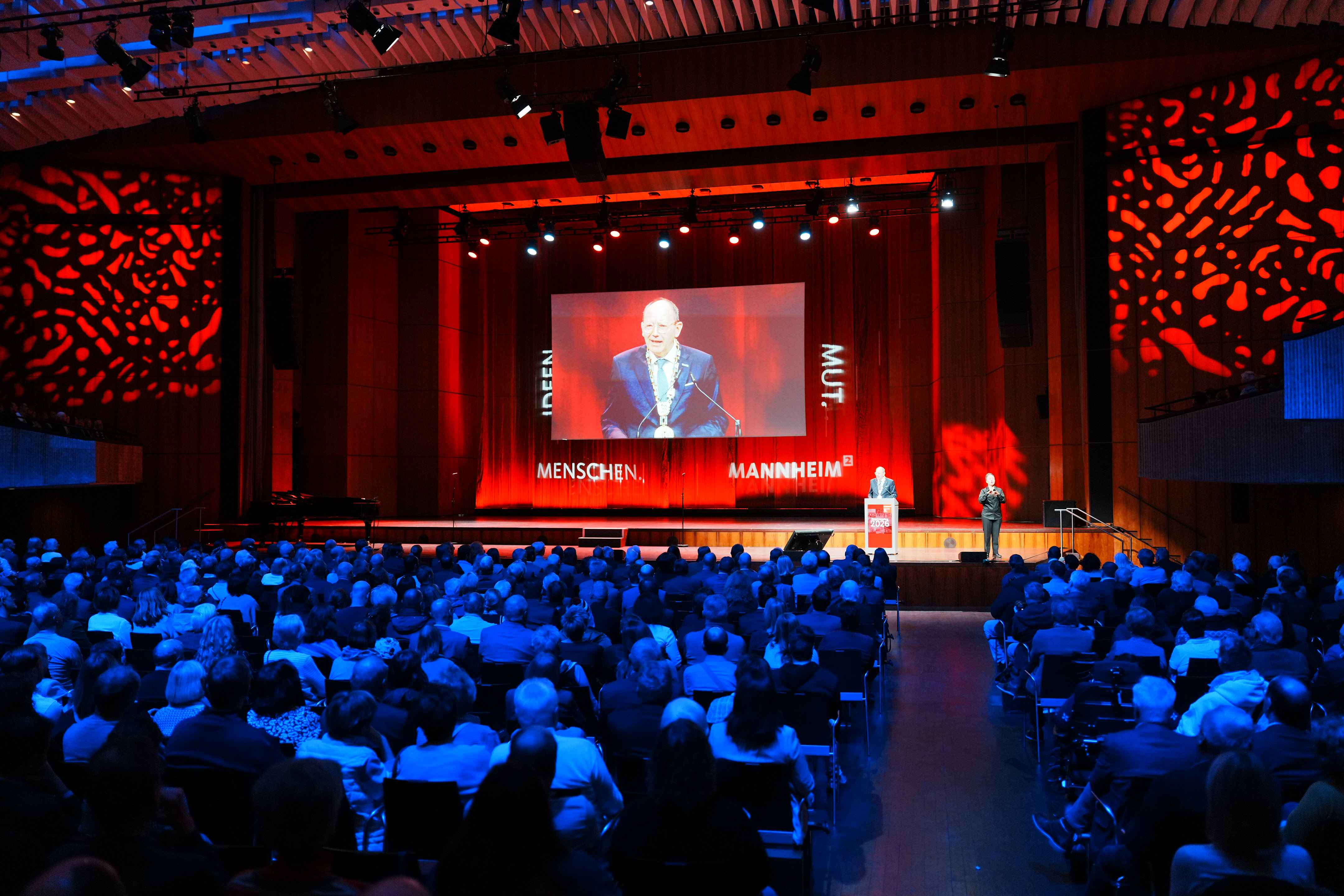 Der Festakt im nahezu komplett gefüllten Mozartsaal wurde von Hockey-Nationalspielerin Sonja Zimmermann und Prof. Dr.-Ing. Oliver Wasenmüller, Professor an der Fakultät für Elektrotechnik an der Technischen Hochschule Mannheim, zusammen mit Roboterhündin Grace moderiert. Im Zentrum des Festakts stand die Neujahrsansprache von Oberbürgermeister Christian Specht. Darin blickte er auf das herausfordernde vergangene Jahr zurück und stimmte zugleich mit Zuversicht auf die kommenden Aufgaben ein: „Was es braucht, ist Mut und Entschlossenheit, ein investitionsfreundliches Umfeld zu schaffen. Wir wollen und werden als Stadt unseren Beitrag hierzu leisten.“ Die Stadt unterstütze die Transformation der Wirtschaft beispielsweise durch den Ausbau der Energieinfrastruktur, Digitalisierung und schnellere Genehmigungsprozesse.