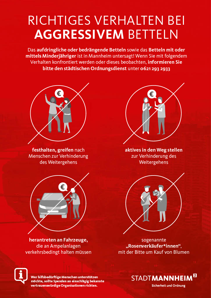 Laut Allgemeiner Polizeiverordnung der Stadt Mannheim ist das aufdringliche oder bedrängende Betteln sowie das Betteln mit oder mittels Minderjähriger untersagt. Wer beim Einkaufen oder dem Stadtbummel damit konfrontiert wird oder dieses Vorgehen beobachtet, sollte den direkten Kontakt vermeiden und den städtischen Ordnungsdienst unter 0621 293 2933 (montags bis freitags 7 bis 24 Uhr sowie samstags 10 bis 24 Uhr) oder das örtlich zuständige Polizeirevier informieren. Im akuten Fall einer Bedrohung oder Gefährdung durch Bettler sollte der Notruf 110 gewählt werden.