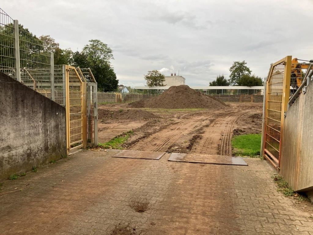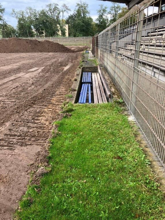 Die Bauarbeiten hierfür haben begonnen. Etwa 50 Prozent des Spielfeldes sind bereits abgeschoben – bislang wurden bereits mehr als 2.500 Tonnen Erdmasse bewegt. Der Fachbereich Sport und Freizeit investiert knapp 700.000 Euro. Für die Sanierung der Rasenfläche wird eine Ansaat mit vorgekeimten Gräsern zur rascheren und dichteren Rasenentwicklung verwendet.