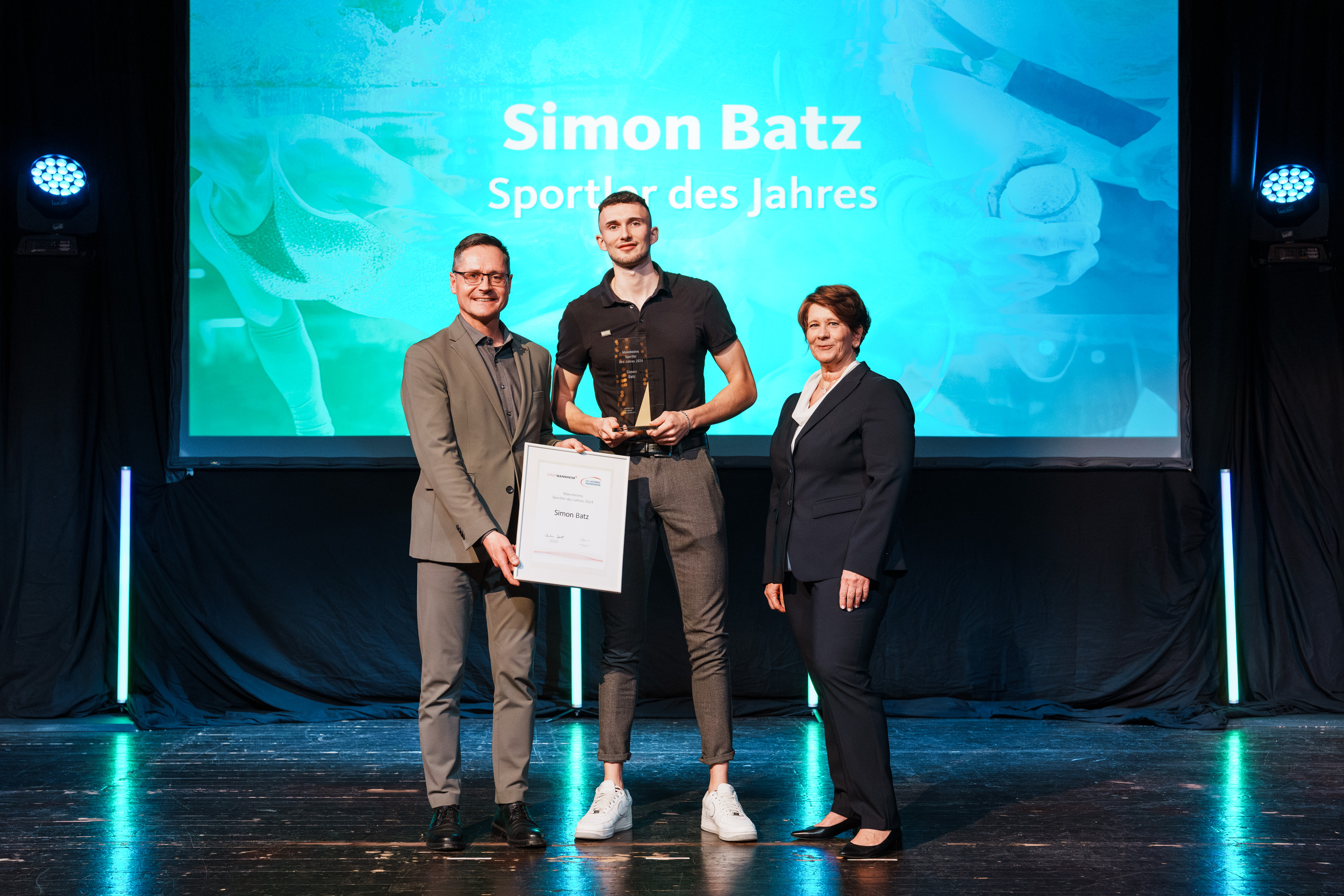 Über die Auszeichnung Sportler des Jahres 2024 durfte sich Weiterspringer Simon Batz freuen. Der Sportler, der ebenfalls Mitglied der MTG Mannheim ist, hat den 6. Platz bei den Olympischen Spielen sowie den 4. Platz bei der Weltmeisterschaft im Weitsprung Halle erreicht. Dazu ist er Deutscher Meister im Weitsprung und im Weitsprung Halle.