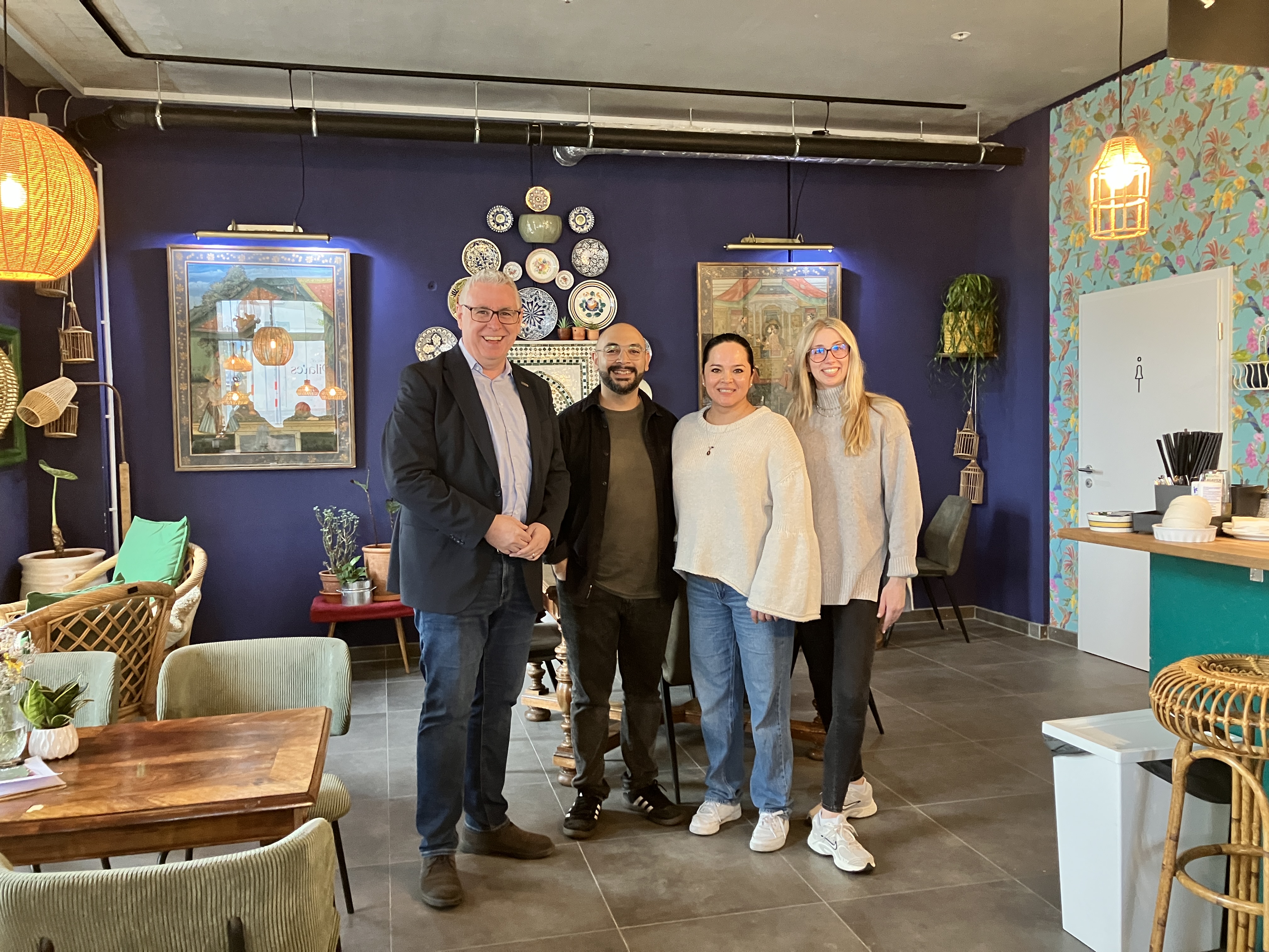 Das Café Bazaar, nur wenige Schritte entfernt, war die nächste Station auf dem Rundgang. Die Inhaber Sabera Maqsudi und Emre Naeem führen das ebenfalls auf der gleichen Straße gelegene Restaurant Granatapfel und blicken positiv auf das junge Quartier Spinelli: Langsam würden mehr und mehr Menschen einziehen, die Stimmung sei gut und man sorge gemeinsam für ein gutes Miteinander. Eine geplante, nachbarschaftliche Halloween-Party im Quartier unterstreicht dies. Mit dem Bürgermeister sprachen sie darüber hinaus auch über eine mangelnde Beschilderung des geltenden Parkverbots.