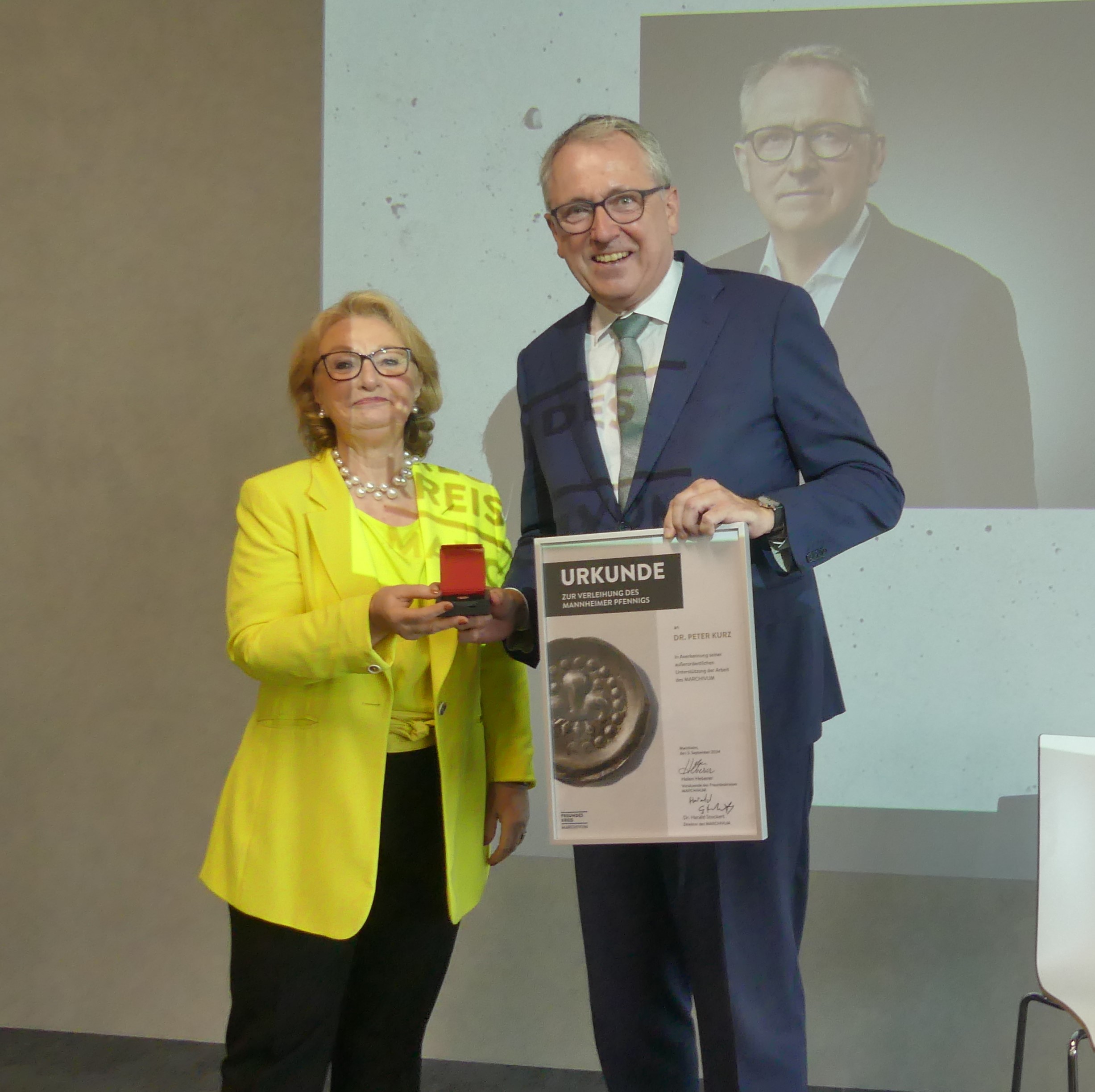 Dr. Peter Kurz ist Träger des 14. Mannheimer Pfennigs, den der Freundeskreis Marchivum an Persönlichkeiten verleiht, die sich in besonderer Weise um die Stadtgeschichte, den Verein und das Marchivum verdient gemacht haben. „Wir freuen uns, dass Sie wegen eines Pfennigs zu uns gekommen sind“, mit diesen Worten wandte sich Helen Heberer, Vorsitzende des Freundeskreises und Laudatorin an Mannheims früheren Oberbürgermeister, der mit seiner Frau Daniela Franz in der ersten Reihe des vollbesetzten Friedrich-Walter-Saals im 6. Stock des Marchivums Platz genommen hatte. Für die Stadt sprach Kulturbürgermeister Thorsten Riehle. Er hob die wichtige Bedeutung des Marchivums hervor, das heute Stadtarchiv und Ausstellungshaus gleichermaßen ist. „Es steht auf einem Fundament, dass an die dunkelsten Stunden der Stadt erinnert und zugleich ein Ort lebendiger Erinnerungskultur ist. Peter Kurz hat die Botschaft und das Potenzial erkannt, die in der Wahl des Gebäudes, dem ehemaligen Ochsenpferchbunker, als neuem Standort für das ehemalige Stadtarchiv – Institut für Stadtgeschichte stecken und den Umzug und die Neuausrichtung maßgeblich und aus Überzeugung begleitet“, sagte Riehle.